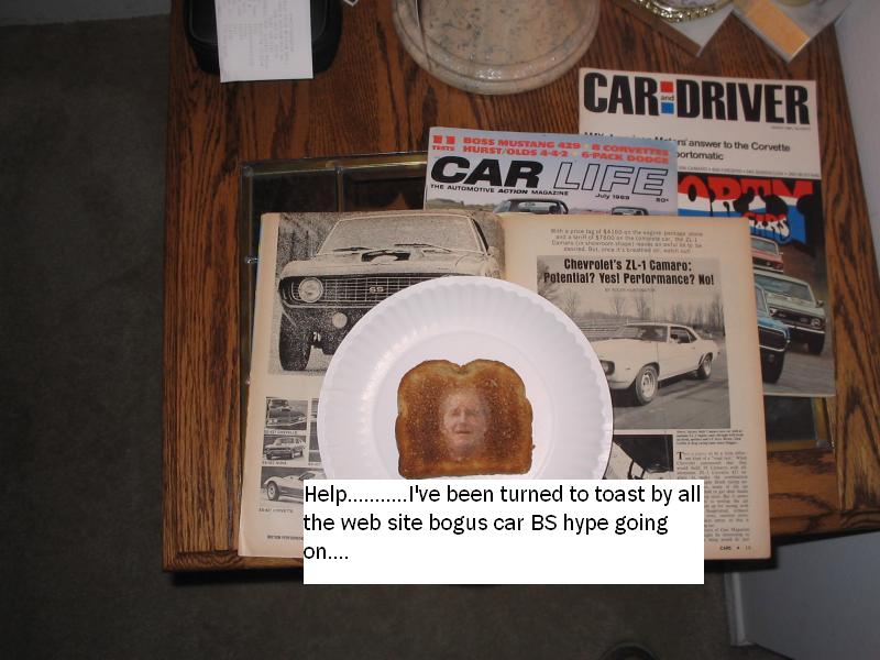 This is totally unbelieavable, I'm spooked and am having a hard time typing this or figuring out what to say!! WOW! This is too spooky... I was running late for work this morning, I just don't know how this happened or why it happened to me!! Anyway I set my breakfast plate with a slice of toast down on a table in my office, I had been reading about a ZL-1 being tested in an Aug '69 Hi-Performance CARS Mag I picked up recently, I tell you this is a sign that could change my life!! I digress, I set the plate down on the pages of the open mag and headed out the door... I get home and find a face was apearing on the toast. It wasn't there when I cooked it or when I set it down!! I just don't know what to say so I guess I'll share the digital pic I took of it with you all. I have been staring at it for an hour and I think , no I know it's Charlie!! Can you believe that? I don't believe it, but it is!! Take a look...