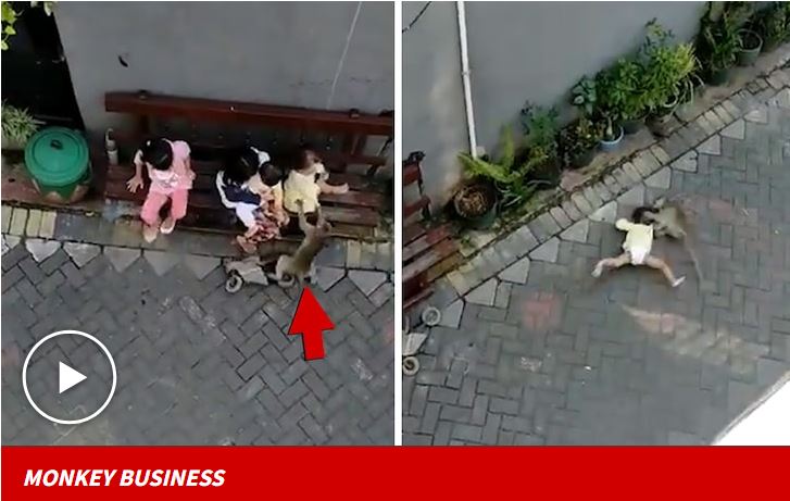 So this monkey rides down a street on a bicycle, stops then attempts to drag a toddler off.