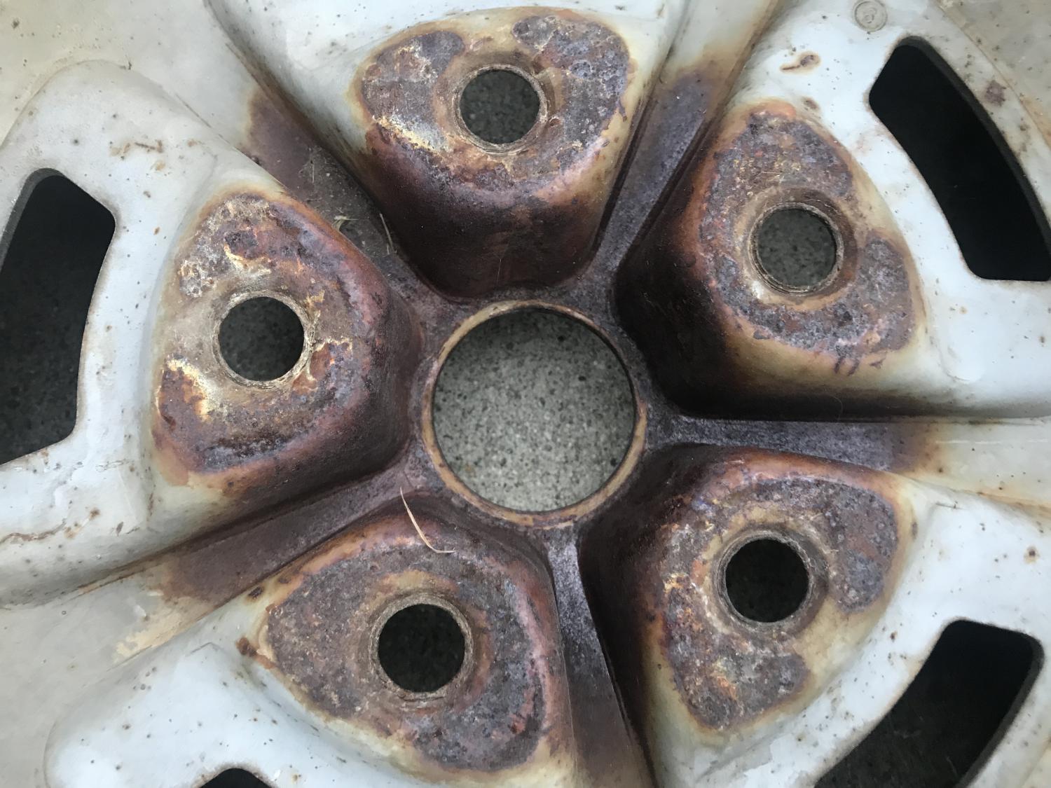 Hi Gang, as shown - wheel is not perfect, it's used but the old bias ply F70-14 still holds air - tire will be removed and discarded of course. Edge of rim will need smoothing for perfect resto - some nicks as shown. lug holes OK, not wallowed out.