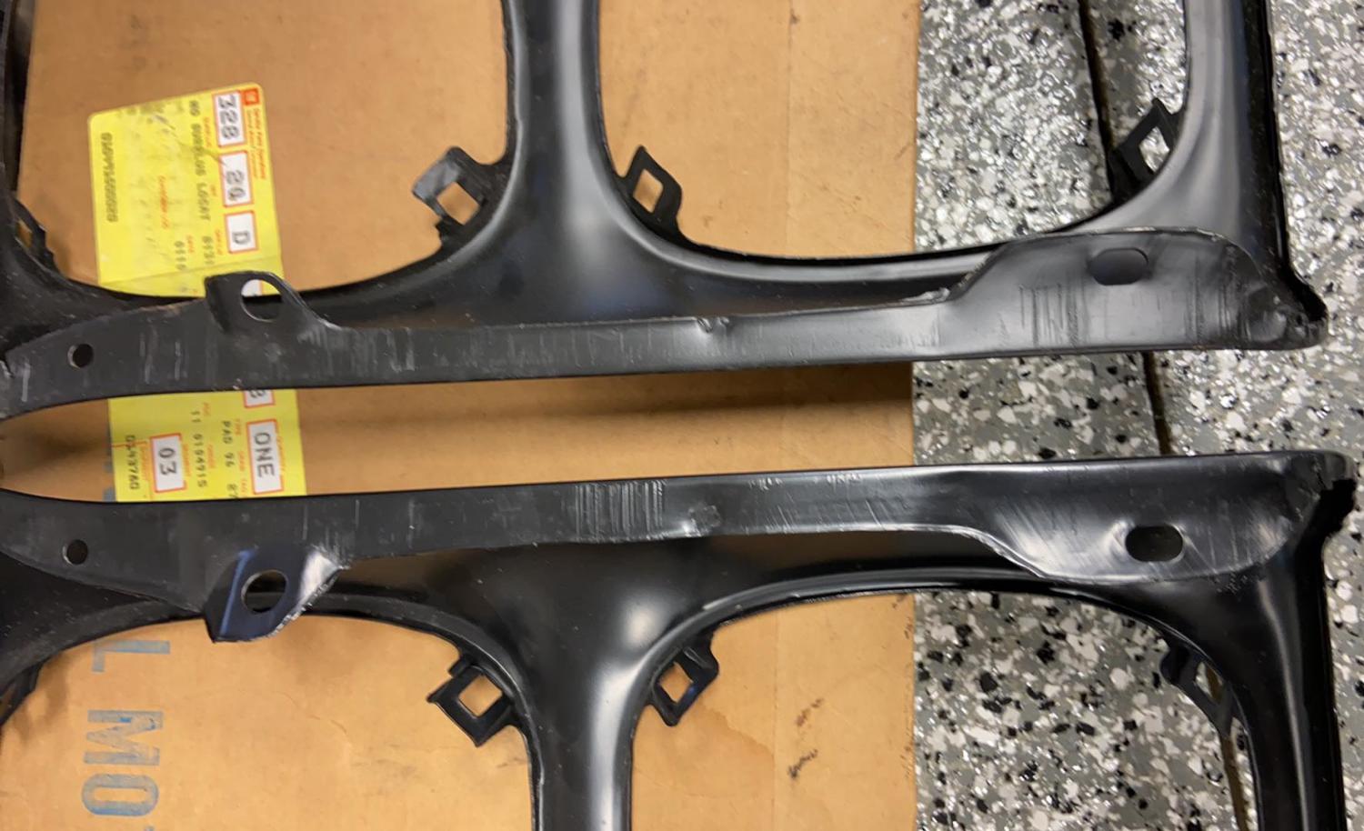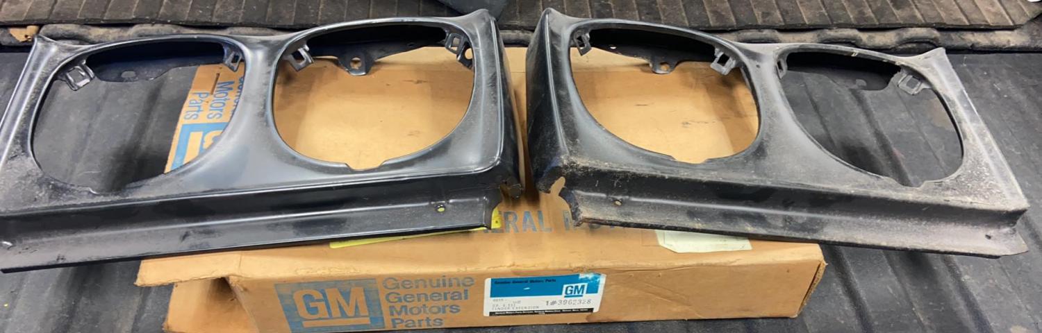 NOS Left and right 3962328 Headlight fender extensions one GM box is missing.