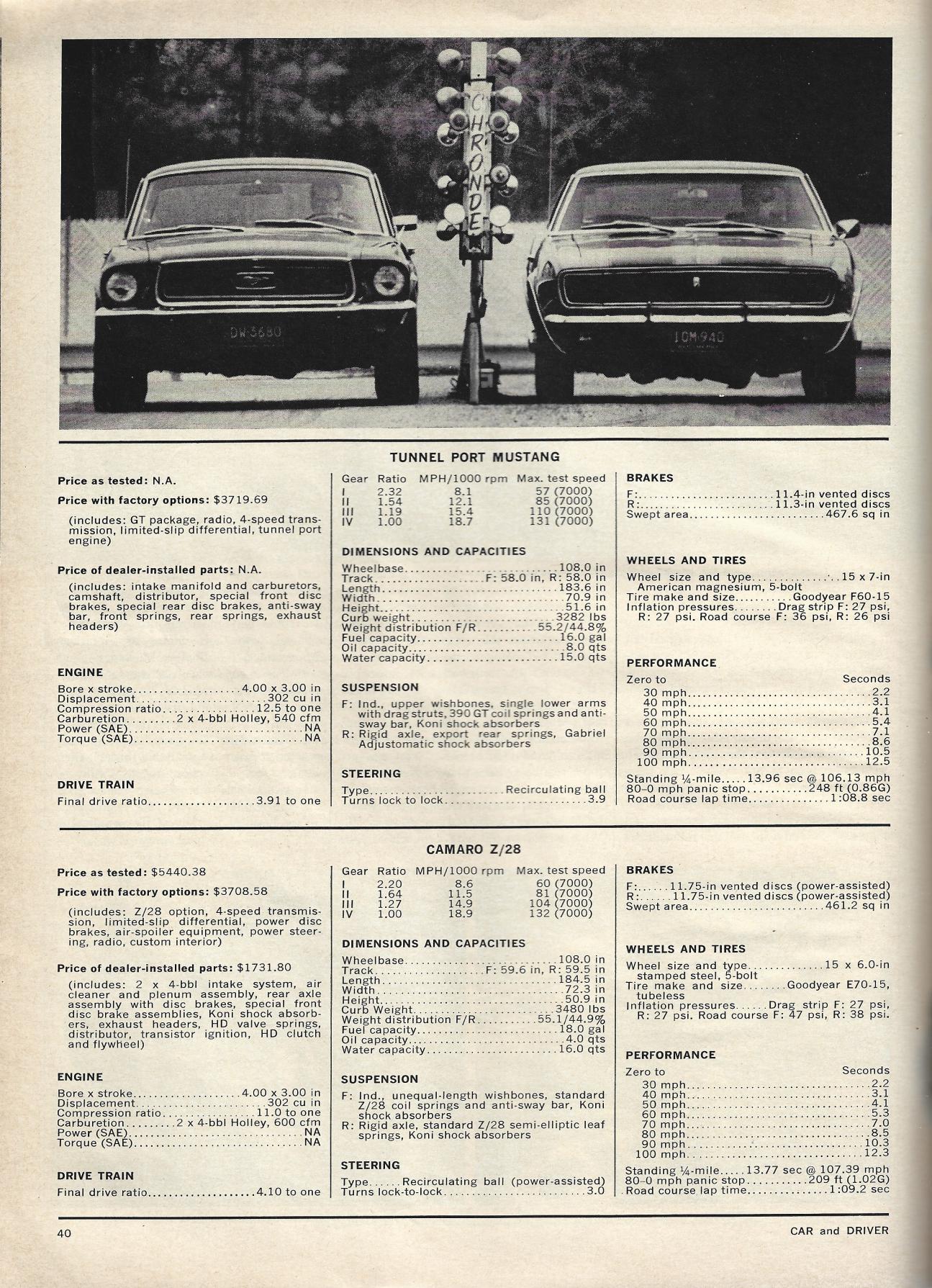 Sam Posey performs a comparison Road Test for Car & Driver. Just an observation, it appears the Mustang is quite warmed over, by the look of the wheels, tires and stance. The Camaro Z28 w/crossram appears quite pedestrian in appearance.