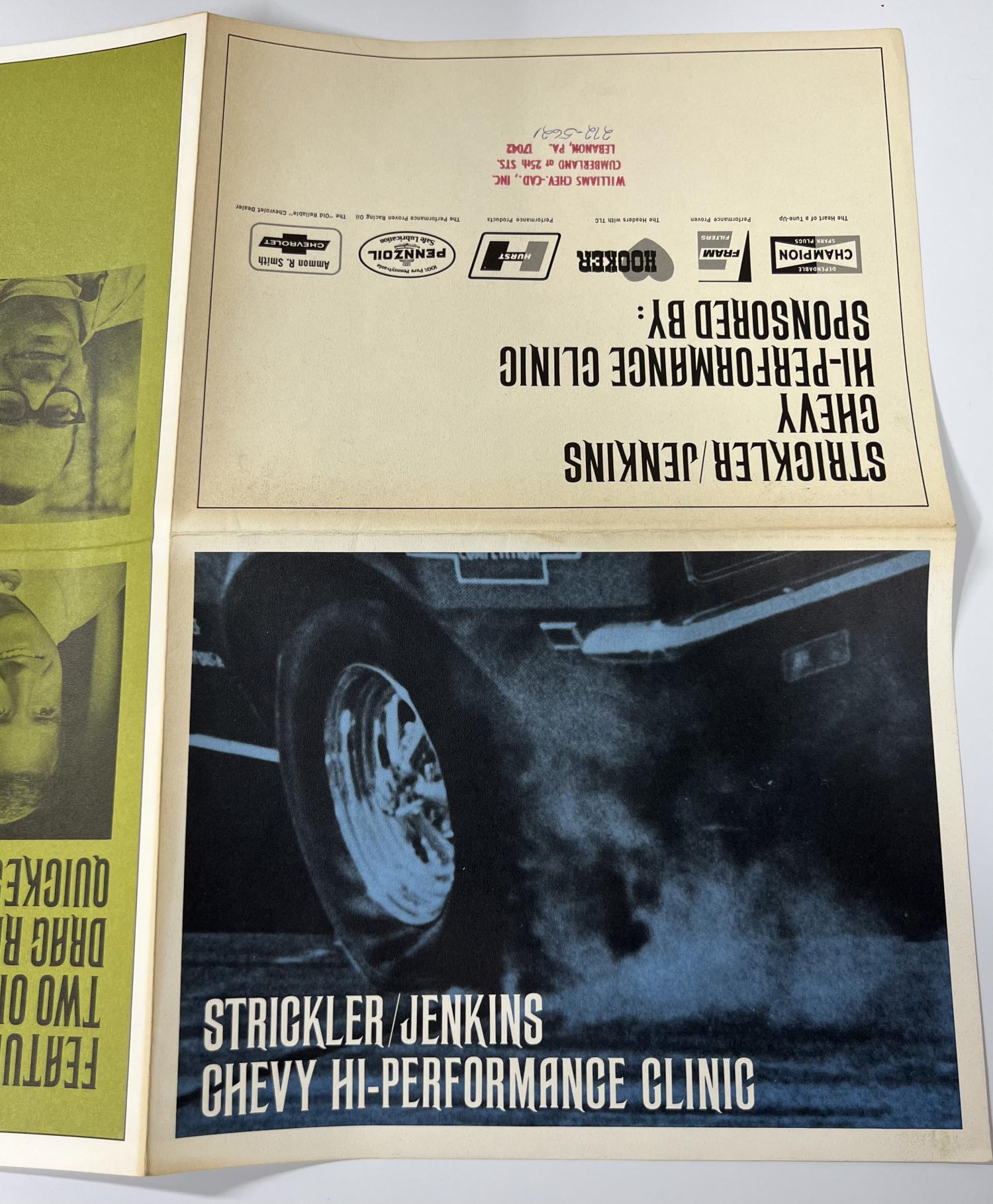 The poster features tech info like Z28 Standard Performance Features, Engine Data, Valve System, Z28 tune up specifications, special performance parts and road racing equipment. The hand out (reverse side) offers a quick bio of Dave Strickler and Bill Jenkins along with great graphics from the Strickler/Jenkins Chevy Hi-Performance Clinic. 20x15 in size.