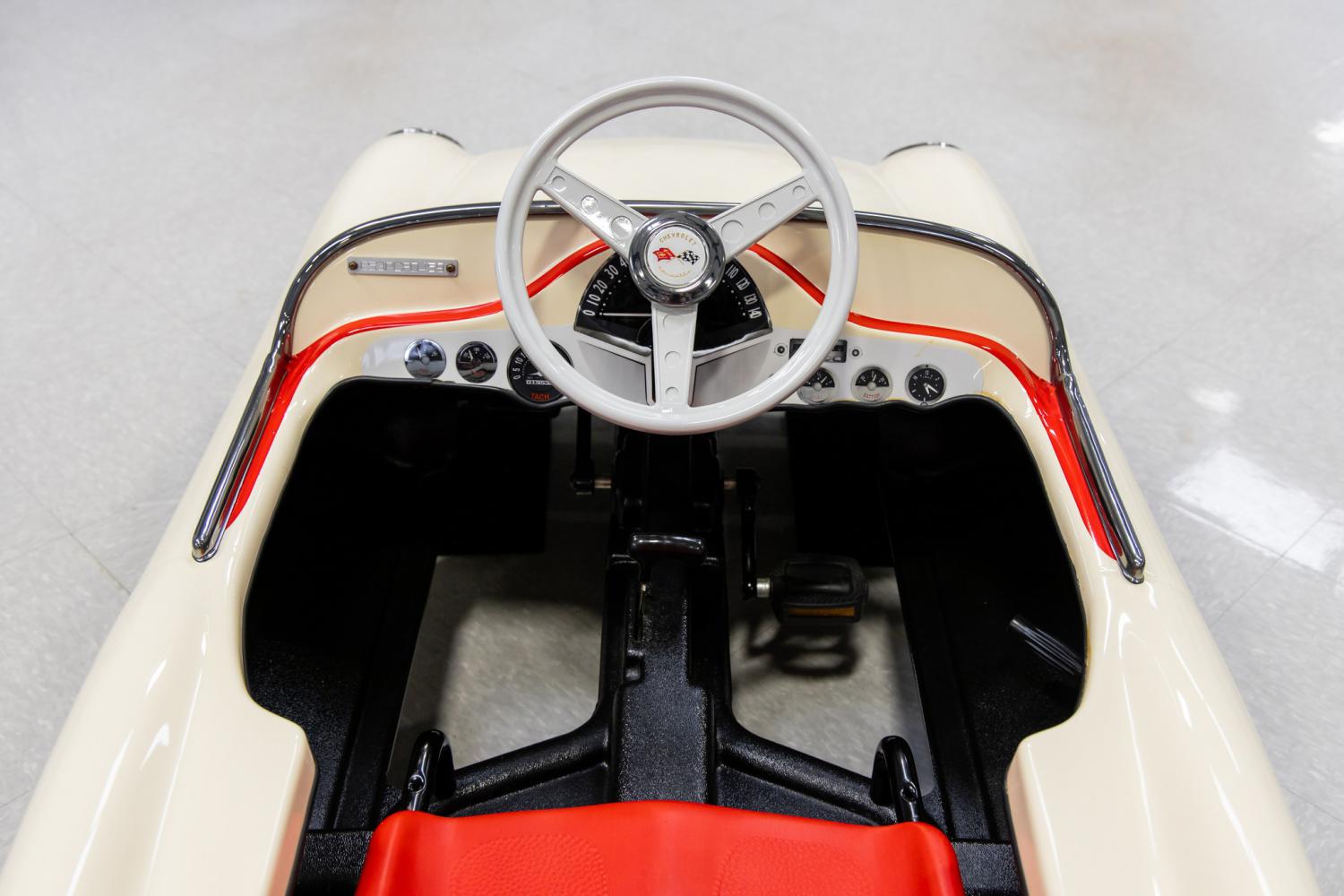 **THIS PEDAL CAR WILL IS CURRENTLY SELLING WITH NO RESERVE ON A BRING-A-TRAILER ONLINE AUCTION. THE AUCTION ENDS ON THURSDAY APRIL 11TH @ 1:58PM EST. IF YOU'RE INTERESTED IN PURCHASING PLEASE REGISTER TO BID DIRECTLY WITH BRING-A-TRAILER. IT'S A QUICK AND SIMPLE PROCESS. PLEASE CALL WITH ANY QUESTIONS. THANK YOU.** This handsome Pedal Car Factory 1953 Corvette Pedal Car is #459 of 600 produced. The overall piece is in excellent condition. The Pedal Car Factory is located in Mayville, NY. This model was built under license from General Motors to commemorate the 50th anniversary of the 1953 Chevrolet Corvette. This example has been treated with the best of care and displayed in the living room of its last owner who lives in Fishers, IN. MS CLASSIC CARS purchased it in March of 2024 and this is the first time it's been listed for sale. The original Operators Manual with Official GM Hologram and stated Vehicle Identification Number #E53PCF0459 is included. As indicated the delivery date was October 10th, 2008. The plastic bodywork is finished in a creamy white color and fitted over a black tubular metal frame. The faux windshield is covered with an interior graphics decal. The headlights and license plate are also covered with graphics decals. The polished trim includes the windshield molding, fixed wipers, headlight bezels, front grille, front bumpers, parking lights, side moldings, tail lights, rear bumper and license plate frame. The nose was decorated with a Corvette emblem and the sides were decorated with Corvette decals. The wheels feature Corvette Spinner style covers with stylized whitewalls and are mounted with pneumatic rubber tires. The cockpit area is reasonably spacious considering the overall size. The dash was finished in creamy white with red trim. The dash fascia was covered with instrumentation graphic decals including a speedometer. The off-white 3-spoke steering wheel was decorated with a Corvette emblem center cap. The red plastic seat can be adjusted to accommodate different size operators. The rear wheels are driven by twin foot pedals which also provide braking force when back-pedaled. A handbrake on the operator's right side also assists in stopping. The inside body retain the original sticker. The underside is in excellent condition. MS CLASSIC CARS will assist in any type of shipping within the lower 48 United States. |