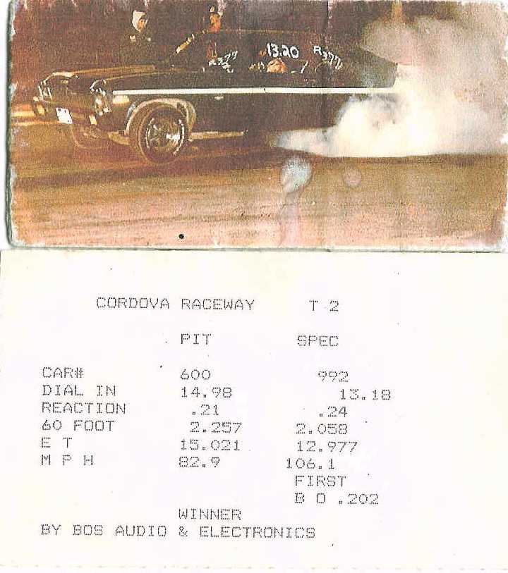 Charlie, I remember seeing those slips and pictures of the car when it was new. I remember the car ran in the 11's or low 12's.