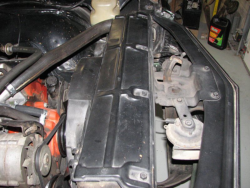 Unlike Camaros, Chevelles have a tin plat on top that bolts to the radiator support and holds the radiator in place. Shroud also bolts to that plate up top.