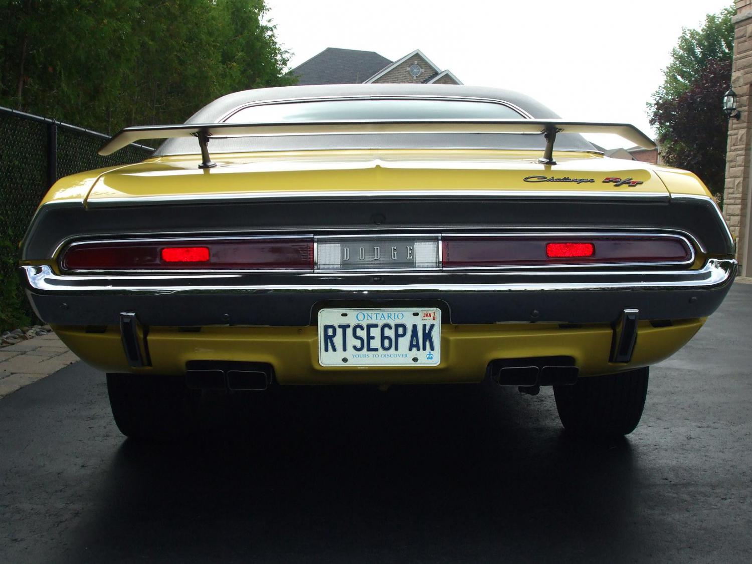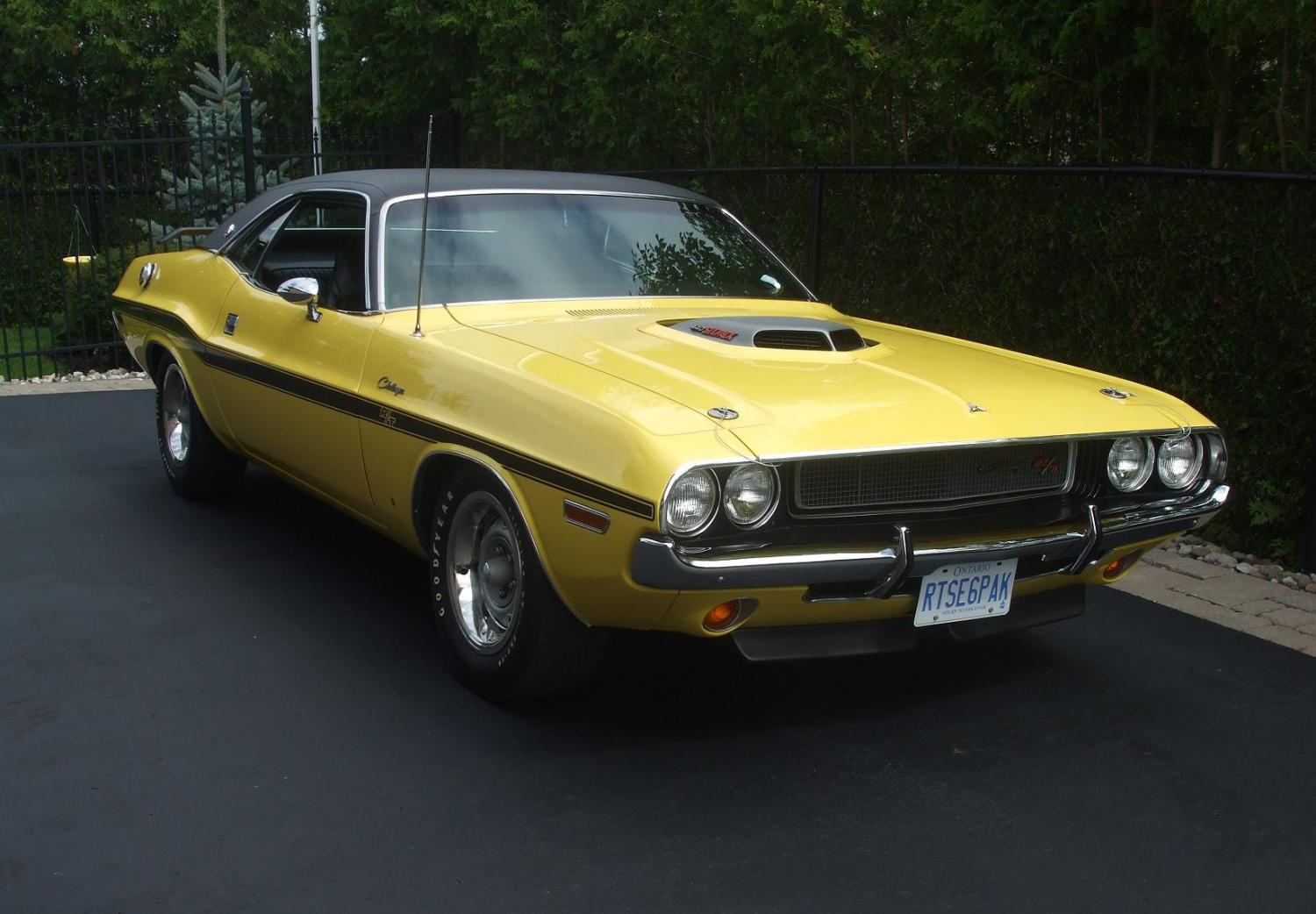 The S.E. Special Edition Model includes >>> Vinyl Roof Covering, Formal Rear Window, Unique Bright Trim Touches (Front splash pan, Door+Quarter Belt Moldings, Hood+Fender Rear Edge Molding and a distinctive aluminum-finished panel on the rear face deck), Leather front seats, Overhead Console/Smooth formed Headliner and Special Edition Door panels with Wood Grain/Carpeted Lower Panel + Reflector. The over head lights in the console ("Low Fuel" "Door Adjar" + "Fasten Belts" all work perfectly.Options Include >>> E87 440 390 HP-Six Pack Motor, D21 Heavy Duty 4 Speed Trans, JS29 Special Edition Model, FY1 Top Banana Yellow High Impact Color, HRX9 Black Bucket Leather Seat Interior, V1X Black Vinyl Roof, A62 Rallye Gauges, B51 Power Brakes, N85 Tach, C16 Console, C26 Overhead Console, C55 Bucket Seats, G34 Dual Racing Mirrors, J45 Hood Pins, N41 Dual Exhaust Tips, V6X Black Longitude Stripe, Y05 Built For USA, 26 26" Rad, A01 Light Package, A04 Radio Group (Music Master Radio, Power Steering, Remote-Control Mirror Etc...), A34 Super Track Pack Group (4 Speed H.D. Manual Transmission, 4.10 H.D. 9+3/4" Dana Axle, Sure Grip Diff, 7 Blade Torque-Drive Fan, Power Disc Brakes, Dual Breaker Distributor and 26" Radiator) Options Added >>> A45 Go Wing+Spoiler Package, C62 Six Way Seat, H31 Rear Defog, J41 Pedal Trim Group, J46 Locking Gas Cap (With Real Mopar Locking Cap), M05 Door Edge Guards, M85 Bumper Guards, N96 Shaker Hood Complete (Real Mopar Parts Used), R35 Am/Fm Thumbwheel Radio, S83 Rim Blow Steering Wheel, U84 F-60 15" Rallye Wheels/Goodyear Polyglas Tires, W34 Collapsible Spare Tire, G11 Tinted Glass. Paint is a true FY1 High Impact Top Banana Yellow with V6X Black Stripe. Drive train is all numbers matching with Rad support,Cowl,Motor and Trans with Vin #'s. Window sale sticker, owner history, previous owners title and service/parts documents Included. A true "V" code car with V0B on the Fender tag and Vin tag. Car is loaded with options and many options were added by the previous owner using real Chrysler Mopar parts. This car is NOT a true N96 Shaker car but all the parts are original Chrysler Mopar parts (there is at least $10,000-$15,000 of parts into the "Shaker" assembly alone). Original hood that came on this car was the R/T power budge hood with the blacked out paint as shown on the fender tag. Car was painted and restored in the early 90's with original floors and body panels on a low mile car. A Broadcast Sheet has never been found in this car. Top End of Motor was rebuilt by me 2 years ago and car runs fantastic. The under carriage is very clean with proper paint dabs/stickers and Yellow over spray feathering into the gray primer. Car is well detailed and presents itself as a show car. 11" Rear "Red" Drum brake covers that came standard on the "Super Track Pack Group". New gas tank installed and Transmission freshly rebuilt 3 years ago by last owner. Quarter Glass on the rear has the Scat Pack Bumble Bee stickers as this car is part of the Dodge Scat Pack Group. Interior is in mint condition and trunk has spare Collapsible Tire/Bottle and complete jack assembly and trunk mat. Car is Registered with "Galen's Registry" #22 of 71 currently known R/T S.E. 440 Six Pack Challengers from 1970. (dated December 30 2008) Car is also Registered with "The 1970 Hamtramck Registry" One of 140 known R/T S.E. 440 Six Pack Challengers from 1970 (dated October 28 2007) Car is also in the Challenger-Registry.com There were only 296 1970 Challenger R/T S.E. 440 Six Pack cars built, 161 were automatics and 135 were four speeds making this car very rare. Original Fender Tag Reads:::::::: V21 V6X Y05 26 EN2 M31 N41 N42 N85 R11 C16 C26 C55 G34 J45 M21 V1X A01 A04 A34 A62 B51 FY1 HRX9 000 A06 025457 E87 D21 JS29 V0B 152xxx (xxx private) Original VIN Tag Reads::::::: JS29V0B152xxx (xxx private) Car is now <span style="color: #FF0000">*SOLD*</span>