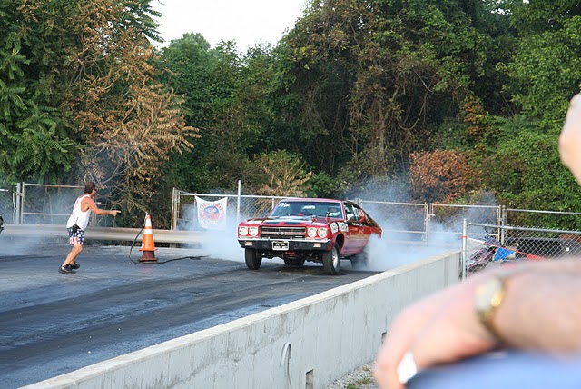 One on the highlights, well actually the main highlight, was at the track on Thursday. I had only made a couple of passé sin Red Alert this year, so was kind of nervous, as I did not want to do anything to embarrass RA in front of all of the Chevelle folks on hand. Well, as it turned out, no need to worry, as RA performed flawlessly, opening with a twisting, front wheel pulling 7.14 and backed by a couple of .08s, at around 98 MPH, which was good enough for low ET among the Chevelles. I was about to load when the PA announcer said there was a local racer with a late model Mustang in the crowd that was going to show the Chevelles how it was done. On his first pass he put down something like a 7:30, at which time the announcer then says are there any takers (Chevelles) wanting to race the Mustang.? How about Red Alert? We,, anyone who knows me I know I cannot let a challenge go, so I agreed to a one race shootout, heads up. Though it appeared I had a couple of tenths on him, I know in the world of drag racing, you never assume anything. They called us to the line, we both did out burnouts, then it was time settle things. As not to give the race away, and because I had relighted on the pass before, I made sure I was slow off of the line. The Mustang got me a .10 off the line, and a .10 at the sixty foot, but once RA settled down I had a .10 on him by the 300’ mark, taking the win light with a 7.0503 @ 98.63 to his 7.2850 @ 94.96. Needless to say the Chevelle folks cheered as I brought RA back down the return road. Later on I visited with the guy with the Mustang, really nice guy, his mustang is his daily driver, but he is one of the top guns at the track. ![]()