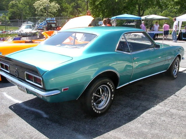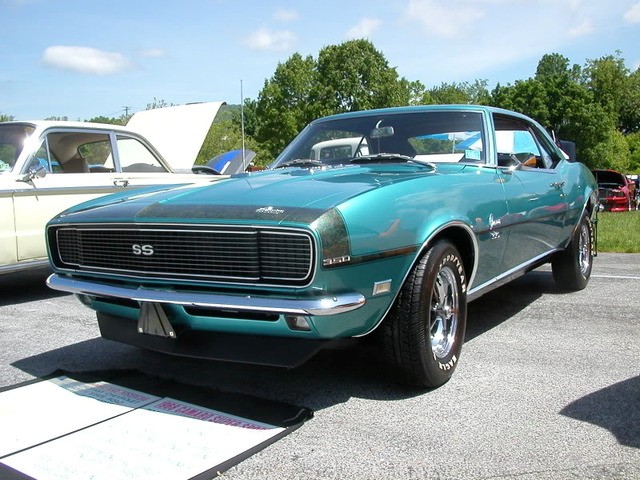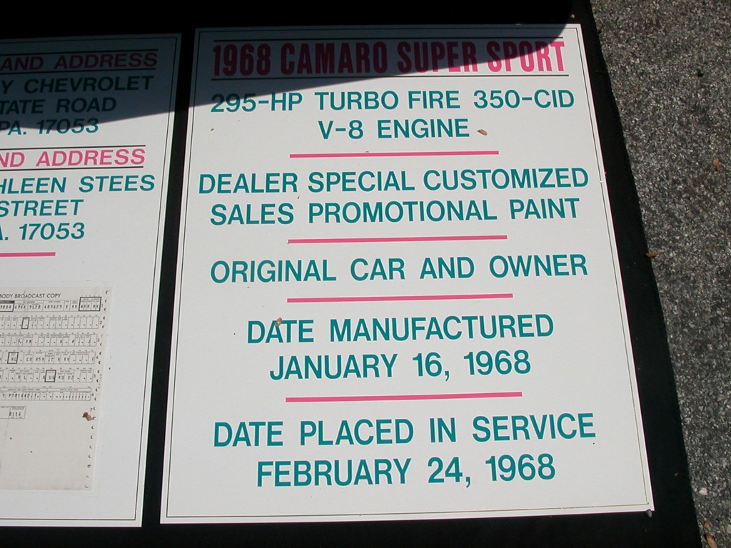 This is a 1-owner 68 RS/SS 350-295 H.P., 4-speed bought new at Keller-Chohany Chevrolet located in Marysville, PA. For those who are familiar with the Harrisburg, PA area there were 3 Chevrolet dealers located within 5 miles of each other. The famous Sutliff Chevrolet in Harrisburg, Sunderland Chevrolet in Lemoyne, and just up the road on RT. 11-15 in Marysville was Keller-Chohany Chevrolet. Keller-Chohany was closed down sometime I believe in the 70's and was a very small dealership. I met Rich, the original owner of this car a couple months ago at a local show in Marysville. He told me the story how he bought the car and they asked him if he wanted to participate in the customized sales promotional paint they we offering, he agreed and this is the what he got. He told me he has all the paperwork verifying all of this and he offered to show it to me, when he invites me to his home. The car still retains its original paint, and has just over 45k miles on the car. His wife likes the wheel combination that is on the car now and he put airshocks on it, but he has kept all the original wheels and the spiral shocks. I surprised him when I offered to give him my Keller-Chohany original license plate frame I aquired when I bought a 69 SS Chevelle from the mechanic who worked at the dealer ship. It was a 325 H.P. w/ HD 3-speed on the floor.