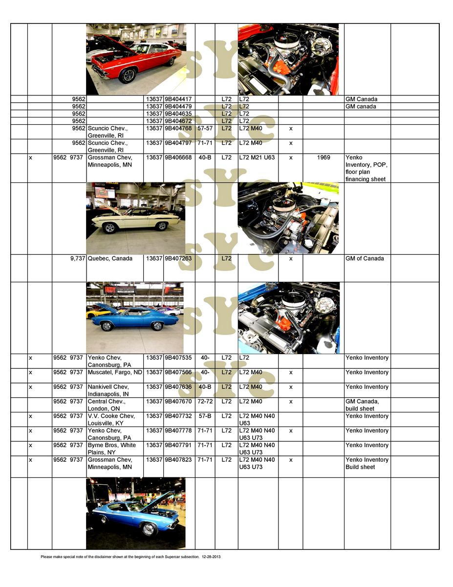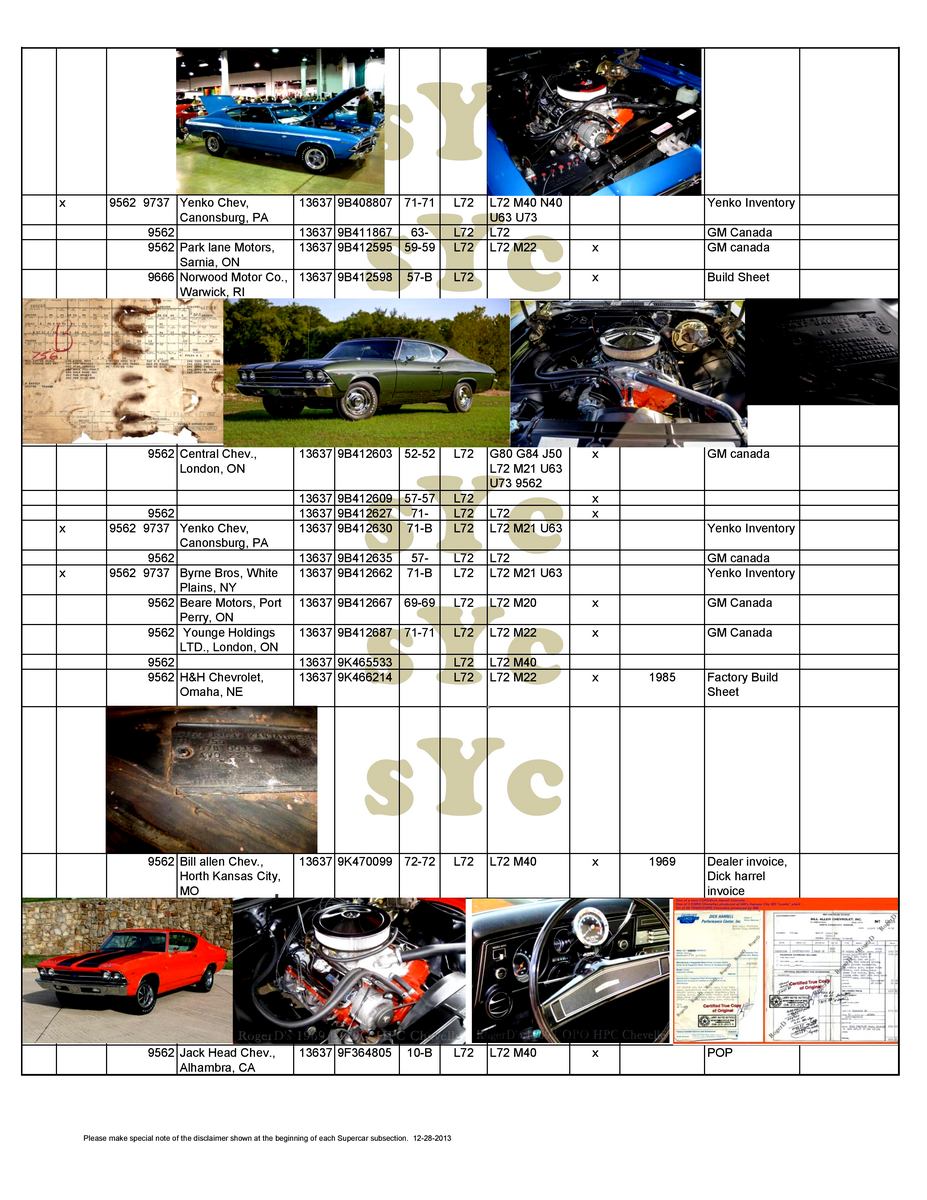 Chevelle sport coupe, four-speed manual, Positraction. Must be used with COPO 9694 disc brake option. 9562BA Chevelle sport coupe, TH400 automatic and Positraction. Must be used with COPO 9694 disc brake option. 9562CD Chevelle sport coupe, four-speed manual, Positraction, bucket seats, 15-inch tires, special coil springs. 9562CE Chevelle sport coupe, four-speed manual, Positraction, 15-inch tires, special coil springs. 9562DD Chevelle sport coupe, TH400 automatic, Positraction, bucket seats, 15-inch tires, special coil springs. 9562DE Chevelle sport coupe, TH400 automatic, Positraction, 15-inch tires, special coil springs. 9562EA Chevelle sport coupe, four-speed manual, Positraction, J52 power disc brakes, F70x14 tires. 9562FA Chevelle sport coupe, TH400 automatic, Positraction, J52 power disc brakes, F70x14 tires. 9694CA Four-speed manual, Positraction, special front disc brakes, J50 power brakes, COPO 9737 equipment. 9694CB As above, but with TH400 automatic. 9566AA Four-speed manual, Positraction, J52 power brakes, Super Sport wheels. 9566BA As above with TH400 automatic, 15-inch F70 raised white letter (RWL) tires on Rally wheels, Speedometer Reducer Gear. |