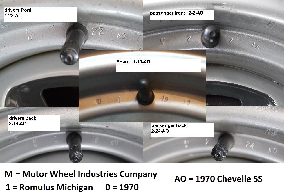I just acquired 10 69/70 SS chevelle rims. I'm gonna keep 5 and prolly sell 5 but I need help with the dates and codes. Most all of them have AO stamped by the valve stem with some numbers. They all have 14/7 JJ 887 stamped on the inside of the rim. Seven of them have made in USA on them and three say made in Canada. Thanks
