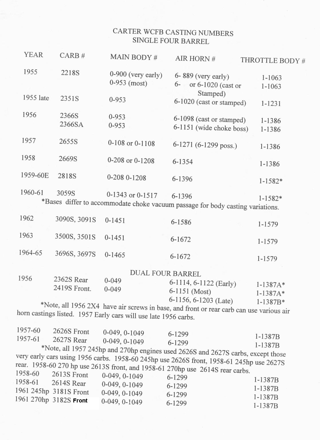I tried to post a pdf of the 50's and 60's Carter carbs used on Corvettes and passenger carbs, but it's too large to do it here. Anyone wants it I can e-mail it though.