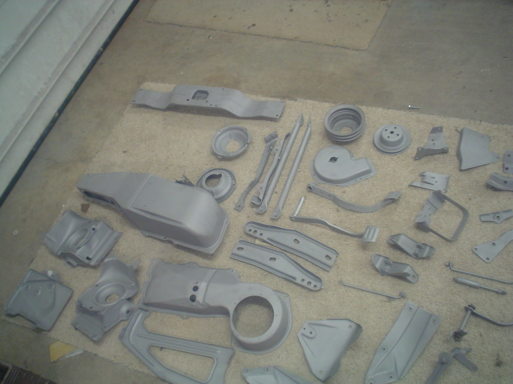 A picture (now 2 pictures) show several bead blasted parts that were done at a body shop OVER a YEAR ago. Now, fast forward to NOW. The 2 totes that were supposed to have all those pieces shown in the totes, when I abruptly and hurriedly had to pick up the car last year in December, for some reason does not have all the pieces. Where are they? Who knows? Yes, I am sad & angry 'cause these are not cheap knock offs, these are the real deal and had been with my car for an amazing 46 years and with one dishonest or careless event, they are now gone. Picture a puzzle that is missing pieces. Some of the parts shown are NO LONGER THERE. If I had all the parts shown that I used to have, I would be very HAPPY, and NOT posting a WANT AD on sYc. Hopefully noone else will say they see the needed part in the pic. One thing though, the pic proves I did have these pieces and not making up a story. Thanks.