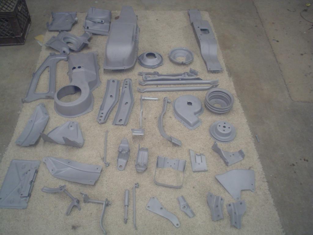 Some here know, and CRG too, I started into a complete restoration of my 69 Camaro about 5 years ago after 36 years of parts scrounging. 1st year went great with me doing the work, disassembling car and the engine build. After much work and 3 years of not finding the "right" body guy, a guy is found only to find him bailing after 8 mos. leaving me with a 1/2 done mess(Dec 14), I went through a 6 mos. depression and did not look at or touch the car. Got a local guy to start on the car in this July. This was a nice unmolested original car that is/was solid with typical Ohio rusted areas. $8k later and still not a stitch of paint on the car! Ok, laugh, but I really got the 'root' and a raw deal. Now, my worst nightmares are coming true. Many of my prize parts are missing, gone, stolen, misappropriated,lost, whatever. The list will surely grow, but here is what I need to replace what is lost, so far: NEED the FOLLOWING: <span style="font-weight: bold">NOS Battery tray. <span style="color: #000099">PROVIDED!</span> <span style="color: #FF0000">Thanks Eddie M.</span> Original to car(OE GM) battery hold down. <span style="color: #000099">Provided!</span> <span style="color: #FF0000">SC69Sammy Scadino thanks bro</span> unless noted everything else following is original to the car=OE OE Lower Alt. bracket with spacer for smog brkt. 69 BB AIM L35 A4 3940939 <span style="color: #FF0000">[color:#000099]PROVIDED![color:#FF0000] Thanks Martin</span> OE Smog pump cradle. L&R lower RS support brkts. AIM Z22 A2 3949627-8 Lower Alternator stud and spacer. RS Washer res. (I believe I have another) so hold up on that. Brace that goes to header -valence and core support and hood latch (center front)AIM 11/13 B6 #4 3937531 <span style="color: #FF0000">Provided! [color:#FF0000]by Spooky (Scott)thanks</span> All the rare Endura bumper braces and hardware. AIM VE3 A1 #1,2(2),5(2),4,6 R&L,9 R&L </span> These were all parts blasted to be painted black. Again, devastated, but my community will rally and make this victorious. Thank you and God Bless. Pic is of the blasted parts while at the body shop. These missing items were just discovered yesterday. The car was whisked away hurriedly when the body guy bailed and stored at a friends (secure)so, just learning of these problems as I get further into the resto.