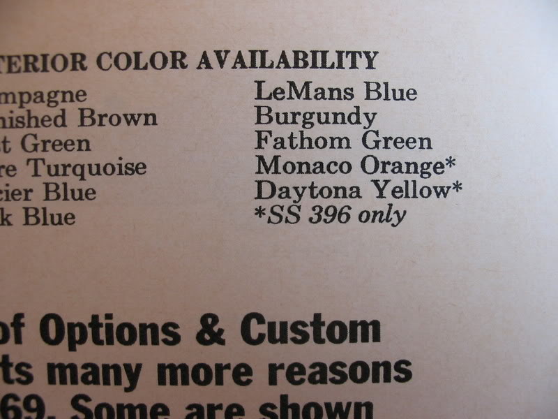 Only Super Sports got that new color originally so it helps cement it's authenticity. And even more so that it doesn't have it's original drivetrain. From my 1969 Chevrolet salemens advertising materials: |