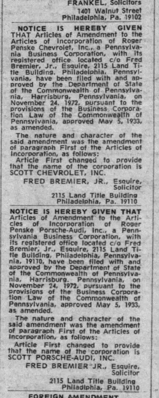Apparently in <> 1975ish Penske sold that dealership to Scott Chevrolet and moved, and the dealership changed but the dealer number stayed the same. My Z, a 70, is original paint in the rear and has the Penske dealer tag, my NCRS came back as 15/488 and multiple web sites show 15/488 as Penske as late as 1972. In fact, the NCRS OWN dealer code database page has an entry for Penske as 15/488 in 1972 verified with "AAA Window Stickers- Bill Petriko", however, in the next entry shows a 1975 entry as Scott Chevrolet as 15/488 with the note "I was given this information by a gentleman who has an official Chevrolet Philadelphia Zone Dealer Directory, March 1975. I believe this was Roger Penske's Dealership in the early '60's prior to his selling to Scott." So common sense is if there is a 1972 entry for Penske, that in 1970, it would be Penske. Their own notes in the 1975 entry even state that the dealership was Penske in the early 60's. Paperwork mistake right? Wrong (unless I am missing something here). Not so much. I emailed their support folks and they say that they used the 1988 data (? Why?) which shows Scott and I would need to provide any official paperwork (such as a buildsheet) proving that Penske was 15/488 in 1970. The NCRS database is not able to be used to verify a dealer code. Ugggh. So, anyone have any official paperwork showing Penske as 15/488 preferably 1970-74? I would really appreciate it. Rich