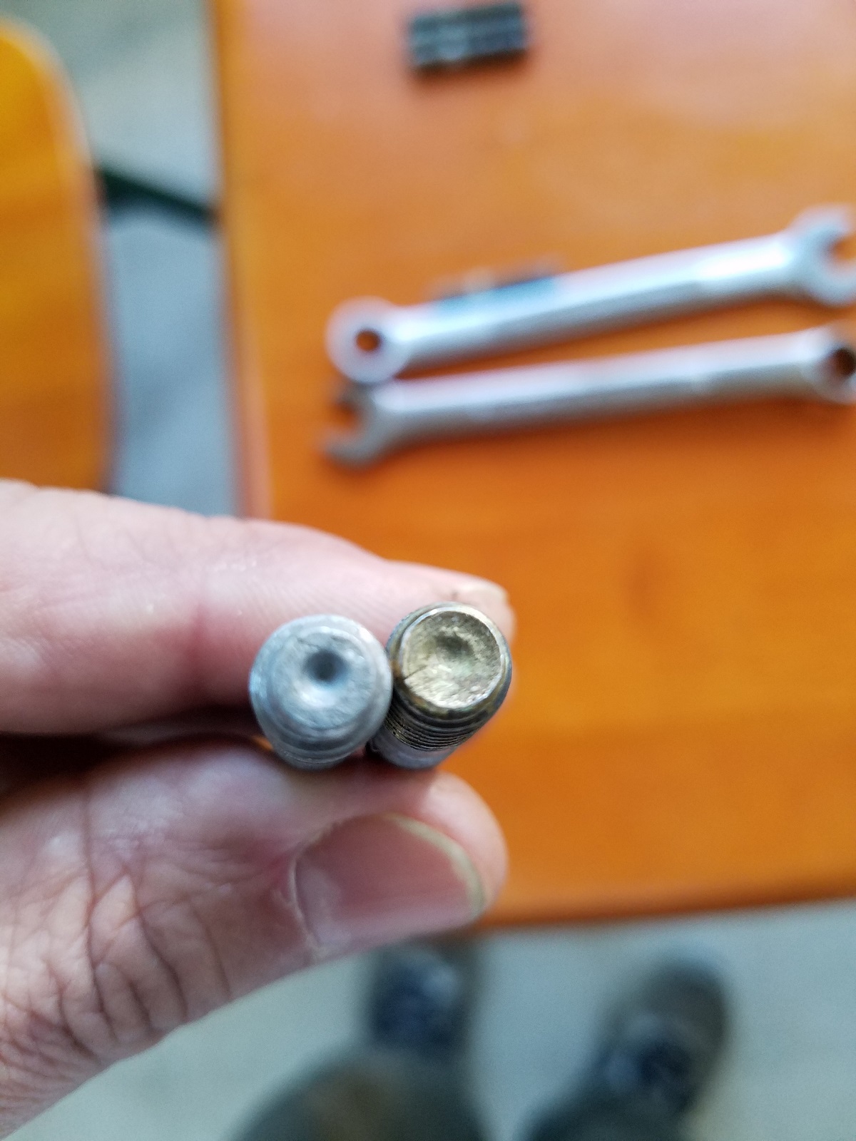 The stud on the left is off the LS6 intake and the one on the right is off my 67 Z28. Notice they they both have a dimple on the bottom side. Also the Z28 stud still has remanence of gold cadmium plating.