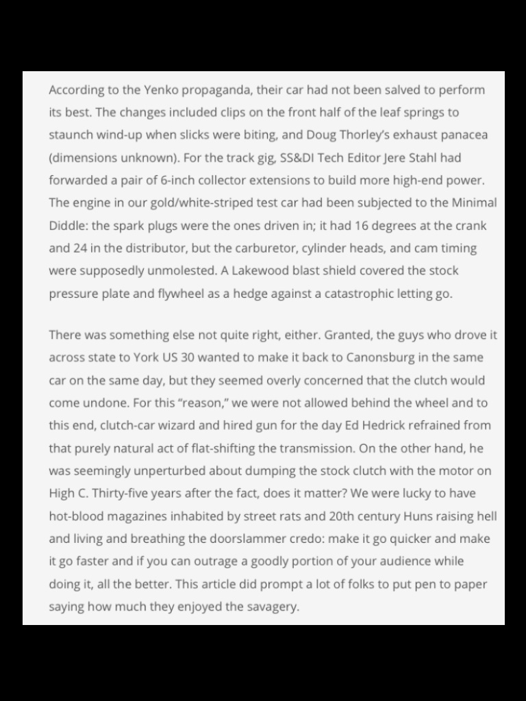 All good Mark and there is no bad if the car and original engine are back together! Yenko delivered w/ the Atlas Rims is cool alone but being the actual Magazine Drag test car Hendricks did the 11.94 with makes this car more than special! ![]() ~ Pete .