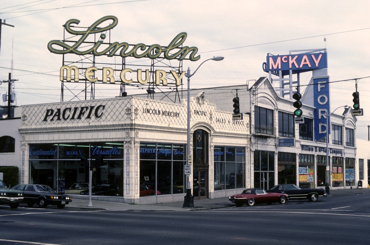 Pacific Lincoln Mercury was one of the great old dealerships that still looked pretty neat when I moved to Seattle in the early 90's. It was located near the south end of Lake Union right downtown. Paul Allen's Vulcan group has been buying up and developing that area for the last 15 or 20 years, and they developed the dealership property. They managed to save the Terra Cotta facade and incorporate it into the new building.
