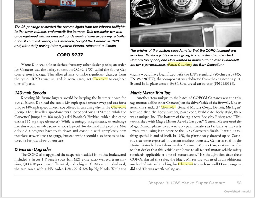 The 1968 Yenko's COPO 9737 Camaros got the "Magic Mirror" tag which at the time was said to be an export tag since it was also found on some export Camaros.