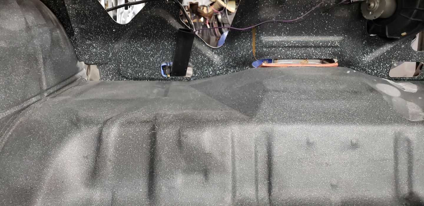 I'm not happy with my latest black/aqua from Parts Place. I ordered a second can and found the specs to be just as small as in the first can. It is no where near the base color or size spatter of the original section on the trunk divider, which I left original. (Photos below)
