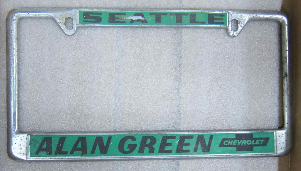 I also thought all these Alan Green license frames used "SEATTLE" and not "BURIEN" on the top bar as the cars they sponsored all stated "SEATTLE" as the dealer location as while the dealership is in what's now Burien, Burien was not an incorporated city until the early 1990's, long after Alan Green Chev was defunct. I live in the Seattle area and have spoken to a number of former Alan Green employees from back in the day and the cars they had on display as part of a commemorative Alan Green display at last year's Corvette and High Performance meet in Puyallup, WA, I believe all referenced "SEATTLE" as well. Just trying to be accurate here.