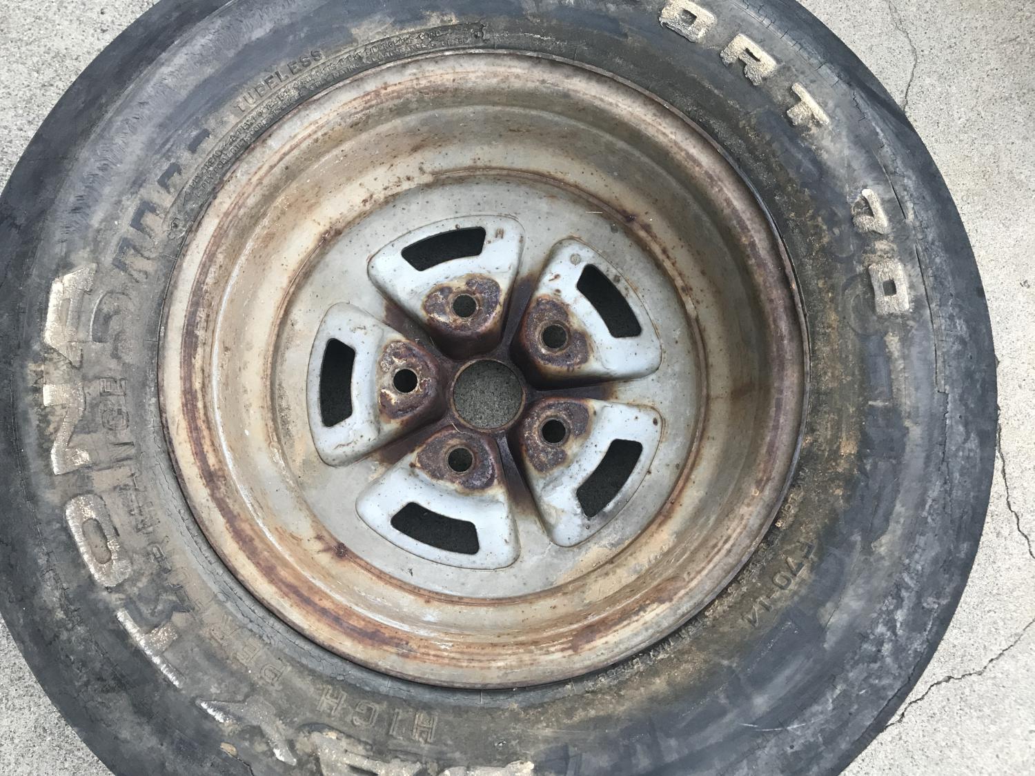 Hi Gang, as shown - wheel is not perfect, it's used but the old bias ply F70-14 still holds air - tire will be removed and discarded of course. Edge of rim will need smoothing for perfect resto - some nicks as shown. lug holes OK, not wallowed out.
