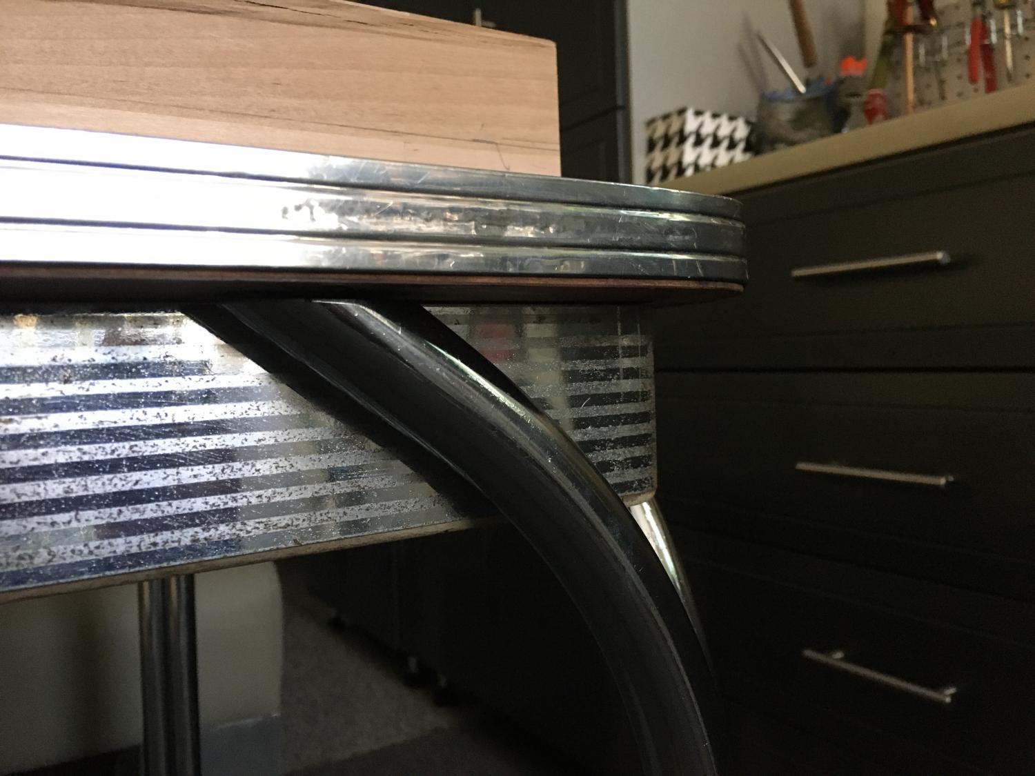 I took a Brillo pad to the legs, they cleaned up nice, then chrome polish, the apron has some surface rust, a magnet sticks to it so it’s gotta be steel, it’s striped, like it was bead blasted to put the design on, I see the double caps are reposed, but only in white and black. Luckily all 4 are in good shape. I’ll,post a pic when it’s all back together, I’ve see the Formica in silver, yellow, and green. There’s no maker on this, I can’t find the exact tab,e on line. I figured mr Lee could locate the pic, lol
