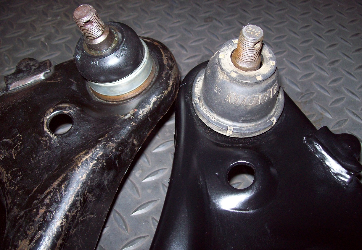 One is a former over the counter GM piece with partial GM label still attached and has welded on nuts for the shock tower (Left one in Photos), the other is a rebuilt original A arm with new NOS bushings and a MOOG ball joint and has NO welded on nuts for shock tower (Right one in Photos). Both have the double hole on the one side only. Both in excellent condition. $420 USD with FREE shipping. Paypal "Friends"