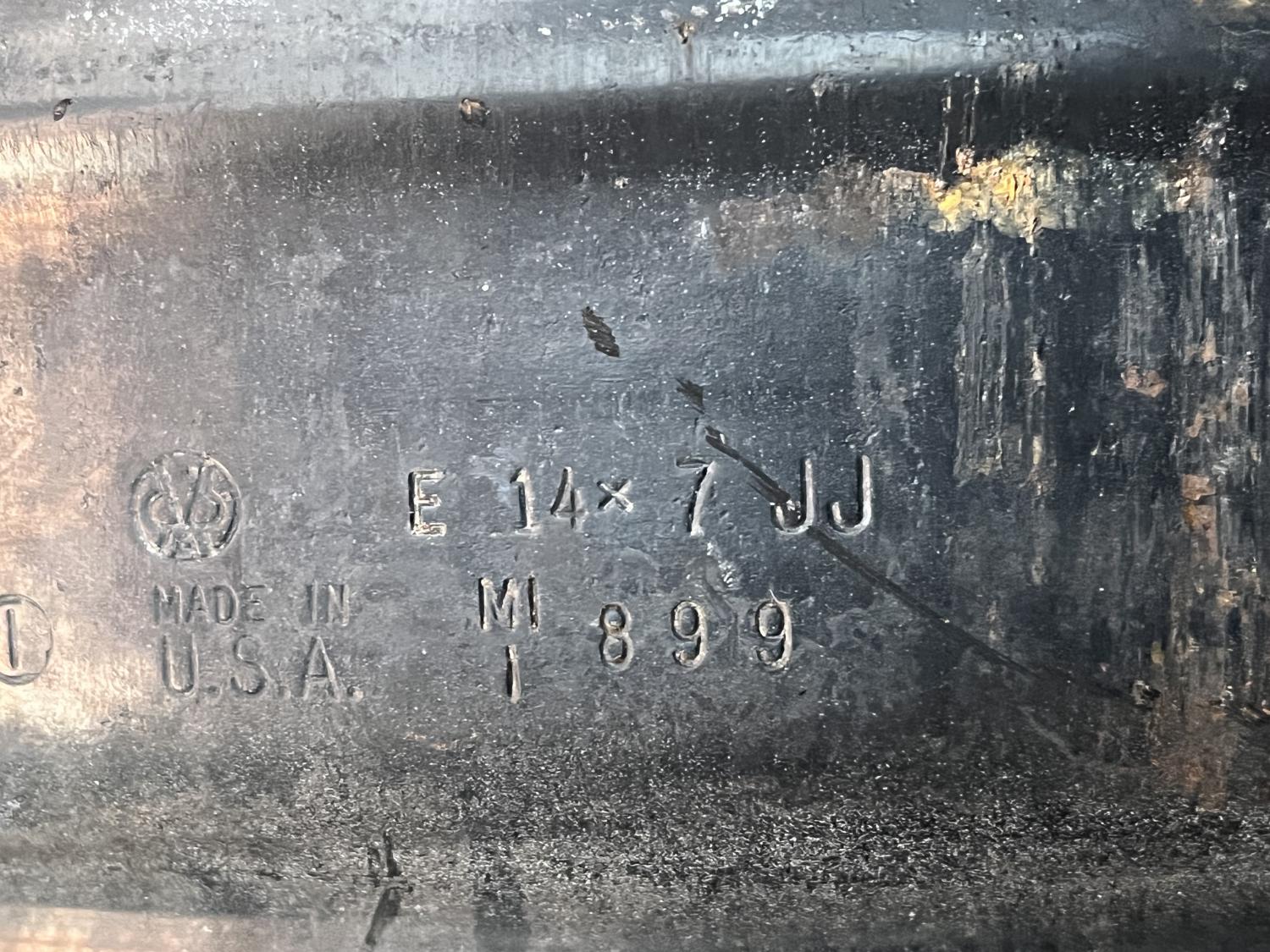 As shown, it is 14x7 and coded JZ, which, as James Bond would say, are chemically identical to conflict diamonds... anyway, it'll take a 68 / 69 dog dish cap as shown (cap NOT included). No fatal flaws, OK for a driver, great candidate for a refurbish / restoration. perfect for a trunk spare that's presented upside down anyway. $125 PPFF plus shipping. Thanks Friends, Anthony |