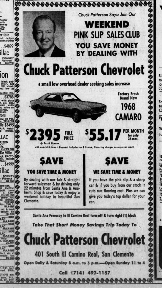 However, there was a Chuck Patterson Chevrolet in La Mirada, CA, 50 miles north of San Clemente, which appears to have been in business from the 60’s to mid-70’s. The 1967 La Mirada high school yearbook actually has a sponsor ad showing a new ’67 Camaro on the showroom floor.