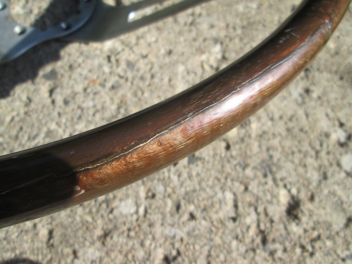 here is a wheel i had restored, it is not a 100 point show piece, it is shinyer that original and is smooth, but still an original wheel in the original color, unlike repo's, the crack was horizontal, you can feel it wil your fingernail, it is at roughly 7 oclock