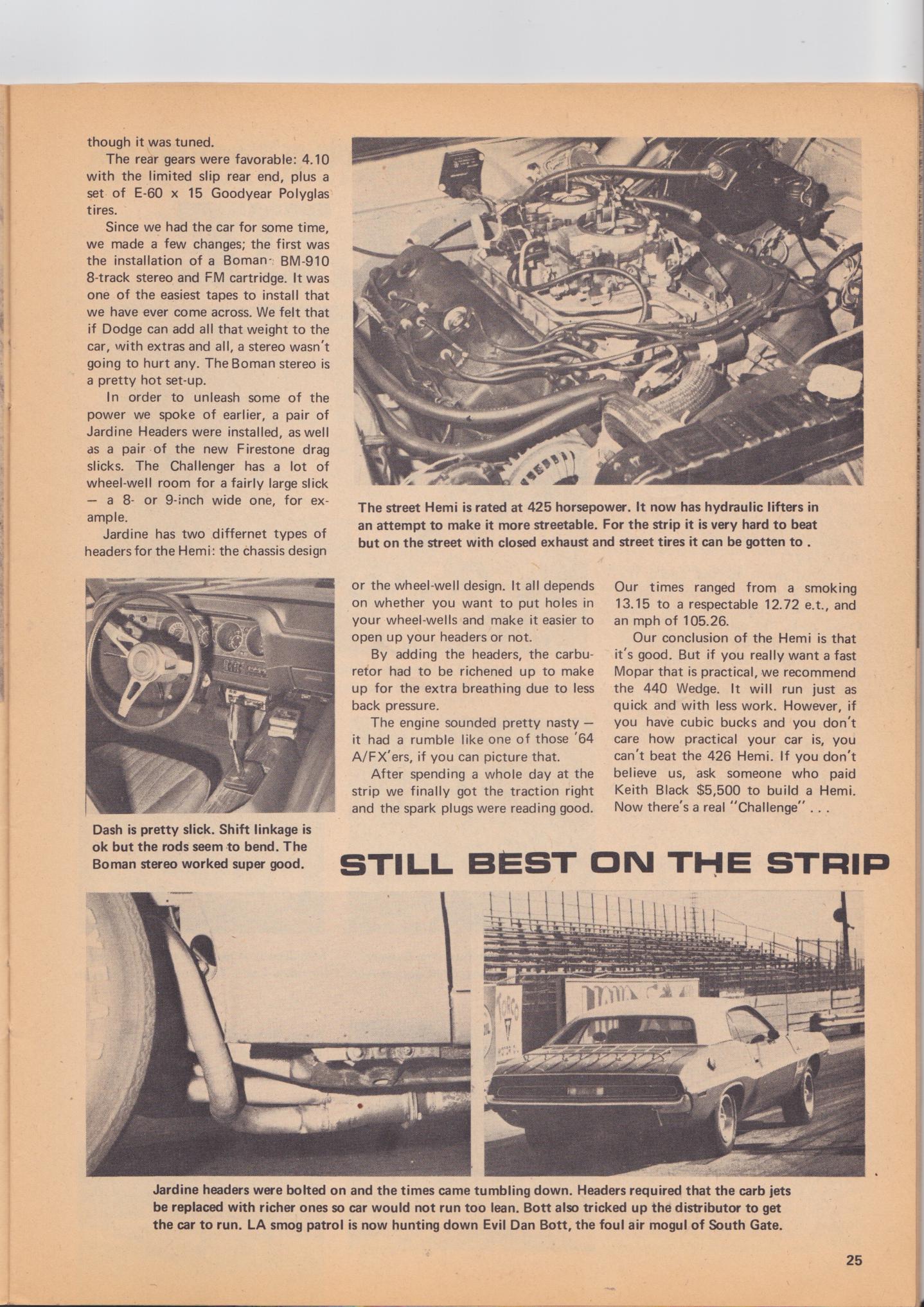 I know a stock ‘70 Hemi Challenger in 1970 couldn’t hang with the Silver Bullet or that Gapp & Roush Mustang in 1975. Could Pennington’s Corvette today through exhaust manifolds? Yes Indeed. Could a 1970 Stock Hemi anything through exhaust manifolds in 1970. No way. Hell, the SS/EA Hemi SuperBird Chrysler built for Jack Werst to beat Ray Allen’s Briggs Chevelle couldn’t run with the Silver Bullet. There were some damn fast street cars back then, and if that Black Ghost car is currently how it was in the 1970s, this guy is probably on to something. Wanna talk about another fast street car from that era, look up the “Mutt Brothers”….that Challenger wasn’t in the same league.