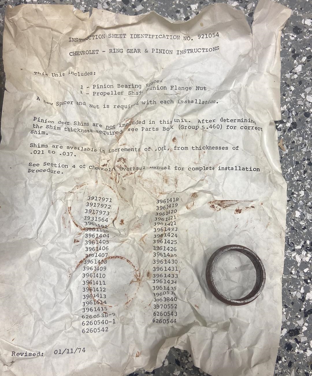 NOS 3822989 Gear Ring & Pinion set with a 3.36 Ratio for 1963 to 1979 Corvette. Pinion is part # 3819186 and Gear Ring is part # 3735390. Instructions dated 1974.