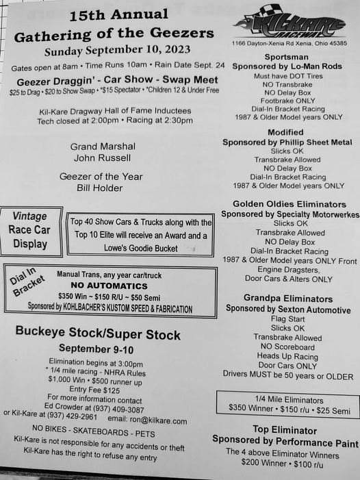 If you are in the Dayton-Xenia Ohio area, this Sunday the 10th is the annual Gathering of the Geezers car show and race event. Usually a pretty good turn-out. It's the 15th year for this.