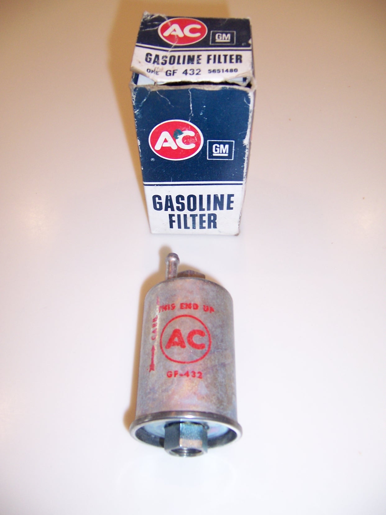 I currently have on eBay one NOS AC/GM GF432 fuel filter, p/n 5651480, still in its original box. This mounts in the fuel line on the front of the engine in various 1969 to 1972 Chevrolet models, big block or small block. In addition to the fuel in and fuel out ports, it has a smaller port on the top side for a fuel vapor return line. I do not know all the different models and years that this may fit, but if you need one, you will know. I had it as a spare for the 1969 Chevelle SS396 that I used to own, but I know that it was also used on the 1971 Chevy Monte Carlo 350 that my wife owned many years ago. It is brand new, still in the original factory packaging, and kept in clean, dry storage ever since I have owned it, which is over 20 years now. Perfect for your restored Chevrolet, when only original GM parts will do. This is being offered with a $9.99 minimum bid and NO RESERVE. Auction ends Wednesday night 6/26.