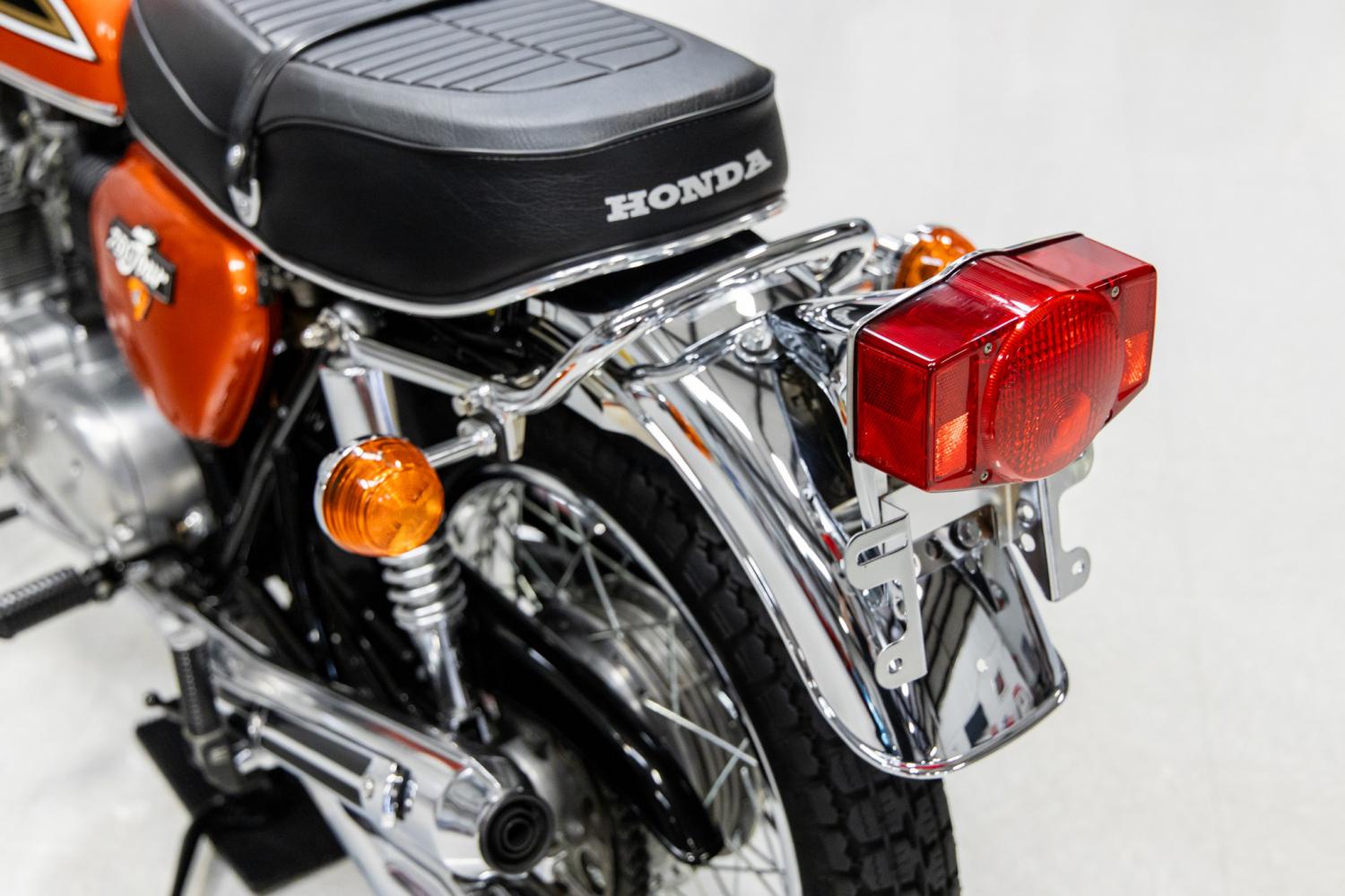 Selling with NO RESERVE this week at the New England Auto Auction at the Owls Head Transportation Museum in Owls Head, Maine. View the auction info here! **THIS MOTORCYCLE WILL BE SELLING WITH NO RESERVE AT THE UPCOMING NEW ENGLAND AUTO AUCTION BEING HELD AT THE OWLS HEAD TRANSPORTATION MUSEUM IN OWLS HEAD, ME AUGUST 23-24. IT'S SELLING ON SATURDAY AUGUST 24TH. LOT #65. IF YOU'RE INTERESTED IN PURCHASING PLEASE REGISTER WITH THE NEW ENGLAND AUTO AUCTION DIRECTLY. IT'S A QUICK AND SIMPLE PROCESS. PLEASE CALL WITH ANY QUESTIONS.** This jazzy 1974 Honda CB750 Motorcycle has been beautifully restored and runs excellent. The Honda CB750 is an air-cooled, transverse, inline 4-cylinder engine motorcycle produced by Honda from 1969 to 1983. It's regarded as the first motorcycle to be called a “Superbike”. The CB750 is included in the AMA Motorcycle Hall of Fame Classic Bikes and it was named in the Discovery Channel's “Greatest Motorbikes Ever”. Cycle World Magazine called it “a masterpiece” and Cycle Magazine called it “the most sophisticated production bike ever”. This example was the product of a professional restoration that was completed in 2020. From the information gathered it's been ridden roughly 1,500 miles since completion. The entire motorcycle was disassembled to a bare frame which was powder-coated black. The chrome handlebar is mounted to the top triple clamp with a raiser that features integrated indicator lights. Instrumentation consists of the factory original Nippon Denso 150-mph speedometer and a matching tachometer with an 8k- rpm redline. A Wagner headlight provides nighttime visibility. The fuel tank was refinished in the factory original color of Flake Sunrise Orange which is decorated with black, gold and silver stripes along with Honda emblems. A new molding was recently added to the bottom portion of the fuel tank. The two side panel covers were also refinished in Flake Sunrise Orange with 750 Four emblems. The left side panel does have a small crack that was touched up. Some of the beautiful bright work includes the mirrors, gauge bezels, turn signals, fenders, grab bar and engine covers. The new black vinyl-upholstered two-up seat offers a passenger grab strap. The 19” front and 18” rear chrome wire-spoke wheels are mounted with Duro tires. The suspension consists of a conventional fork with black gaiters as well as dual partially shrouded shocks mounted to the swingarm. The braking is handled by a front disc and rear drum. The motorcycle is powered by the 736cc SOHC Inline 4-cylinder engine that was factory rated with 67hp. The engine is fed with the correct four Keihin carburetors and breathes through the correct four into four exhaust system. The engine features a kick starter and an electric starter. The engine runs and sounds excellent! The engine is coupled to a 5-speed manual transmission which shifts smoothly. It features passenger folding foot pegs, side stand and center stand. The CB750 was rated with a top speed of 125 mph. It's hard to imagine something that's 50-years old looks this stylist. |
