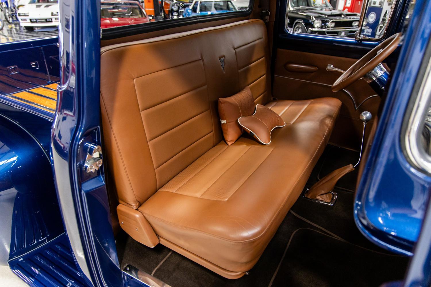 Known as “Blue Shadow”, this 1956 Ford F-100 custom pickup is equipped with a Ford Lighting 5.8L V8 with Inglese 8-stack fuel injection, Ford Performance T-5 manual transmission and modified chassis. As the original VIN number indicates, this example was built at the Chicago, IL factory as an F-100 model with a 238 V8. It was built by Bob Pierce of BP Customs and Rods located in Connecticut. It earned the “Builders Choice Award” and “Designers Pick” at the Goodguys East Coast Nationals. The two awards are included with the sale. Since completion it's only been driven 115 miles as it was trailered to most shows and events. Everything on the truck was restored or replaced to high show-quality standards. The body is extremely straight with excellent panel fitment. The customized tilt forward hood and doors open very nicely. It was refinished in Volkswagen Shadow Blue with DuPont ChromaBase products. The paint has been detailed to a brilliant shine and ceramic coated with Gtechniq Serum Ultra. The front windshield, side vents, side windows and rear window was replaced with new Hehr tinted glass. It's equipped with modern headlights, LED tail lights and LED third brake light fabricated into the rear cab. It's been outfitted with Billet Specialties Heritage 20” polished wheels and Falken tires. The smooth bed inner panels were painted and enhanced with stainless hardware, Oak floors and stainless slats. The Ford embossed tail gate is supported with chrome hinges and latches. The interior dash was slightly modified by incorporating Vintage Air Conditioning controls and side vents. The cabin was painted body color to match the exterior. The headliner and sun visors were upholstered in tan cloth. The custom kick panels, door panels and bench seat were upholstered in soft brown leather. The floors are covered with custom brown carpeting and molded floor mats. Some of the interior custom features include LED lighting, rear view mirror, Classic Instruments Retro black gauges, Flaming River tilt steering column with billet levers, Flaming River Banjo steering wheel, Specialty power windows, power door locks, power seat, billet door handles, chrome shifter with matching leather boot, seat belts and Custom Autosound Secertaudio SST with remote control that flips down from under the dash. The painted engine compartment is highly detailed throughout. The smoothed firewall showcases a Ford embossed logo and the inner fenders are covered with aluminum panels. The truck is powered by a rebuilt Ford Lighting 5.8L 351 W V8 that runs excellent. The engine was upgraded with a roller cam and Ford Racing GT40 aluminum heads. The engine is equipped with an Inglese Intake and 8-stack fuel injection system with Fast Fuel management. The engine is dressed with high-quality Profile aluminum valve covers and Billet Specialties Tru-Trac pulley system. Some other upgrades include a Ford Racing starter, MSD ignition system, Billet Specialties alternator and power steering reservoir. The engine is cooled by a Griffith aluminum radiator with a SPAL electric fan. The engine breathes through ceramic coated headers and a ceramic coated dual exhaust system with polished Borla mufflers. The engine is coupled to a Ford Performance Super Duty T-5 manual transmission with hydraulic clutch. The power is transferred to the Ford Mustang GT POSI rear end with 3.27 gears. The undercarriage is highly detailed throughout. The original chassis was modified for additional strength and to accommodate the upgraded parts. It's equipped with a Heidts Mustang IFS front end with power rack and pinion steering and a 4-link rear end with QA1 coil overs. The Wilwood braking system consists of 6-pistion red calipers with 14” drilled rotors on the front and red calipers with 12.88 drilled rotors on the rear. This truck has been completely serviced and detailed which is documented with an invoice that's included. From the MS CLASSIC CARS Collection.