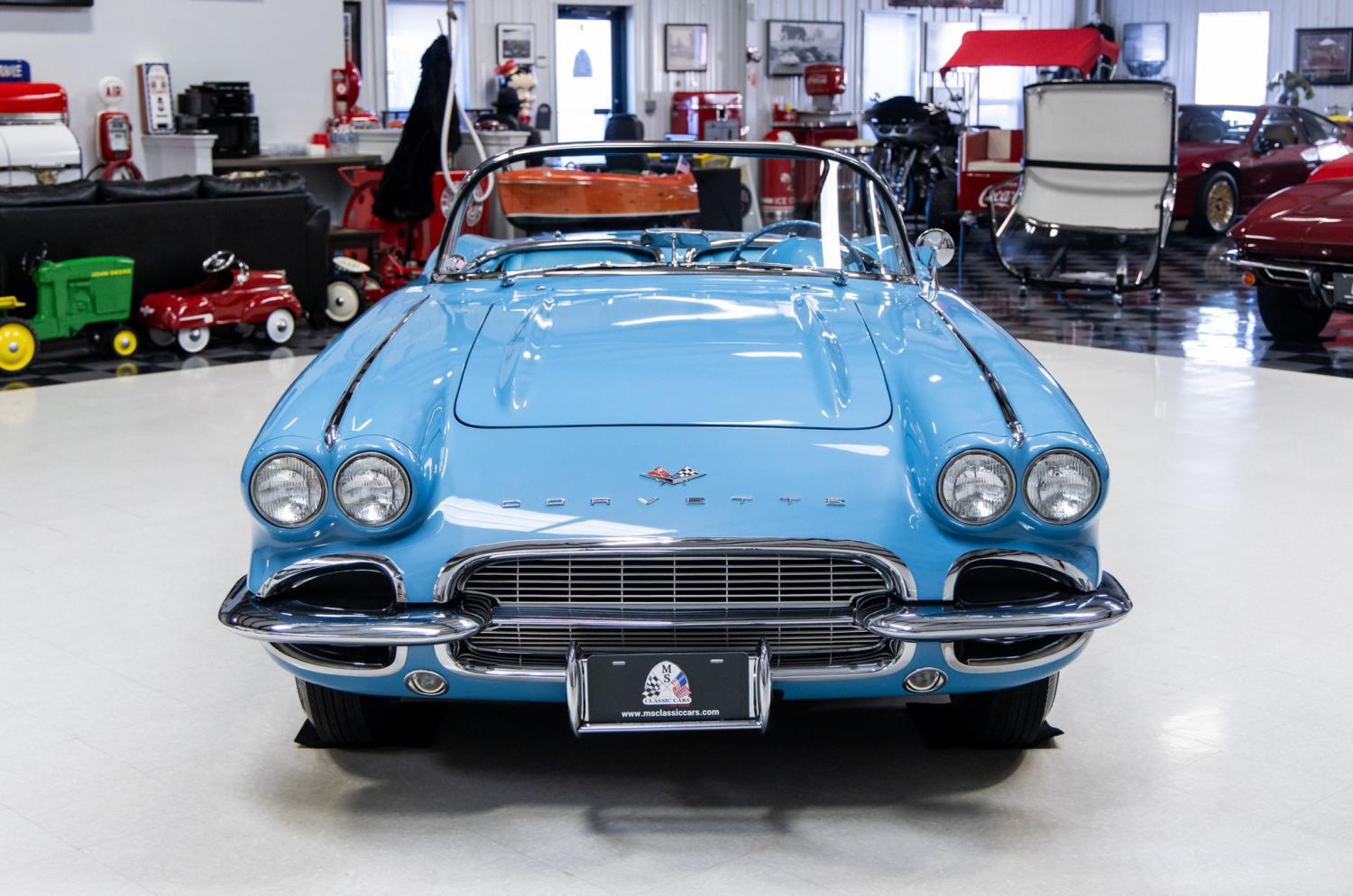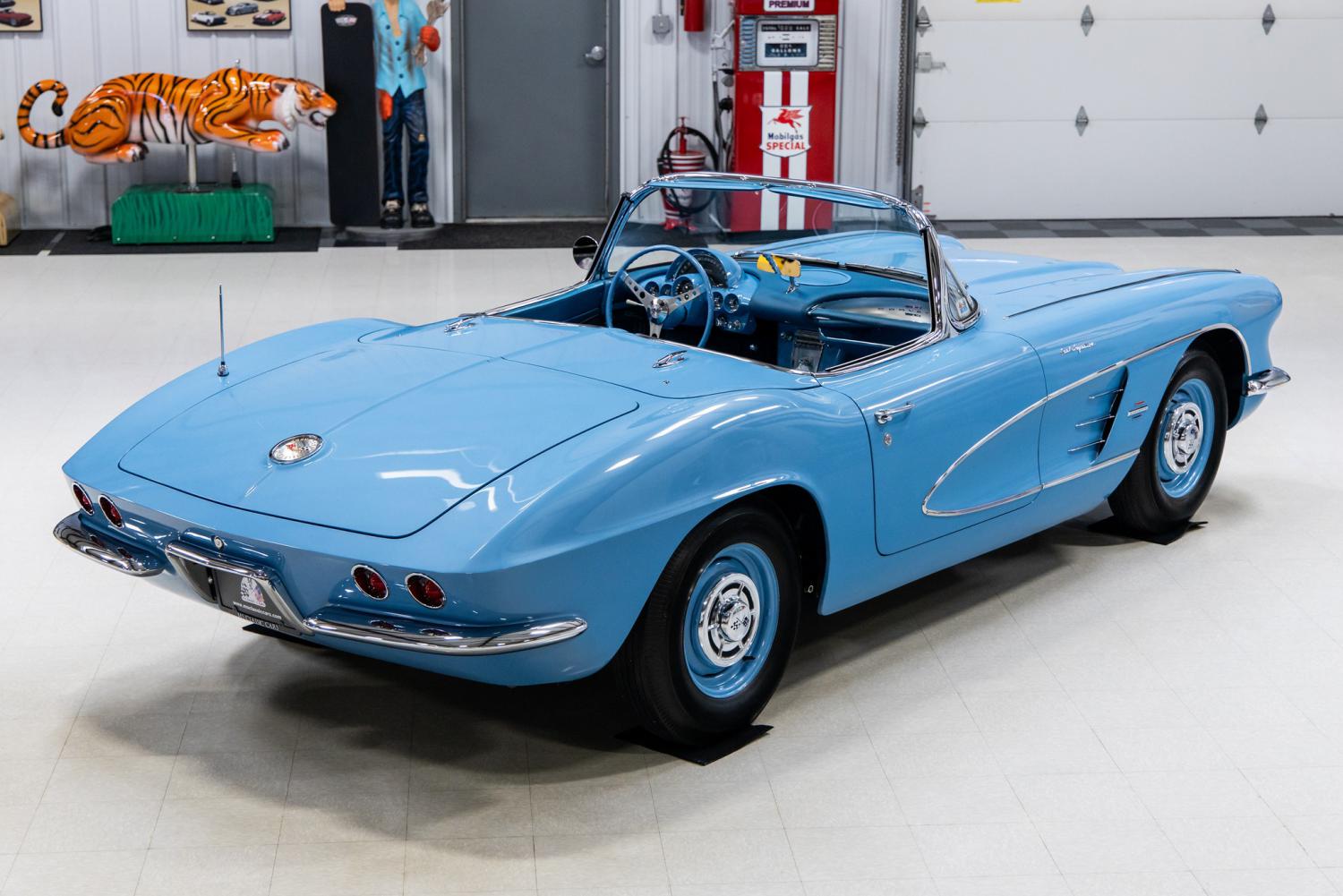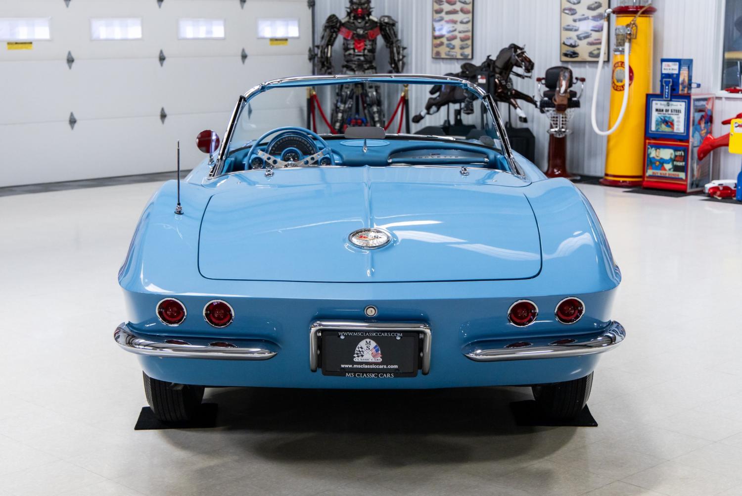 This gorgeous 1961 Chevrolet Corvette Convertible Fuelie one of only 1,462 produced with the 283/315hp fuel injected V8 engine. This example was correctly restored to show quality standards and has achieved a NCRS Top Flight Award scoring 98.2 points. The NCRS owner's card, NCRS judging sheets and NCRS Top Flight Award are included. A total of 10,939 Corvette Convertibles were produced in model year 1961. Of those, only 855 were painted Jewel Blue which was exclusive to a 1961. Of those, only 1,462 were equipped with the 283/315hp fuel injected V8 engine. The exterior styling was facelifted for 1961. It was the first Corvette without heavy “teeth” in the grill area. The forward headlight bezels were painted body color. The rear was completely restyled with four taillights, now a Corvette tradition, but a new look for 1961. This was the last year for use of 283ci engines in Corvettes. The example was originally ordered with a Jewel Blue solid color exterior and blue interior. It features a Black soft top and a body-color auxiliary hardtop with new stand for storage. This example was the product of a complete frame off restoration from 2012 to 2015. It was restored by well-known Dave Evans of Evans Investments located in Blue Springs, MO. The restoration was done using an NCRS 1961-1962 Corvette Technical Information Manual and Judging Guide which is included. This restoration was done with an open checkbook and miscellaneous receipts are included. Upon completion, about a year later it was purchased by a gentleman named Jack Wallace who lives in Missouri. Jack, an NCRS member earned the NCRS Top Flight Award on April 15th, 2017. Jack sold the car in 2018 to another gentleman named Rocky Boler who lives in New York. Rocky, a collector displayed the car proudly and drove it seldom. Rocky decided to sell the car after 8 years of ownership and it was purchased by MS CLASSIC CARS in January of 2025. At the time of purchase the car only had 112 miles on the odometer. February of 2025 is the first time it's been listed it for sale.