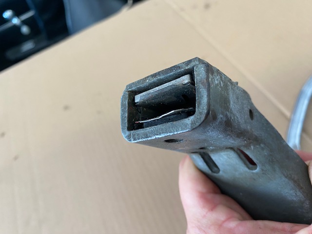 The shifter body is in excellent original condition, no rust. Its has been stored inside for 40 years, the chrome handle is in excellent driver condition, no big gouges, chrome still shinny, also in excellent condition is the correct small block mount bracket retaining most of its original plating. Shifter handle rubber and stamped steel retainer for the handle is intact and in great shape.