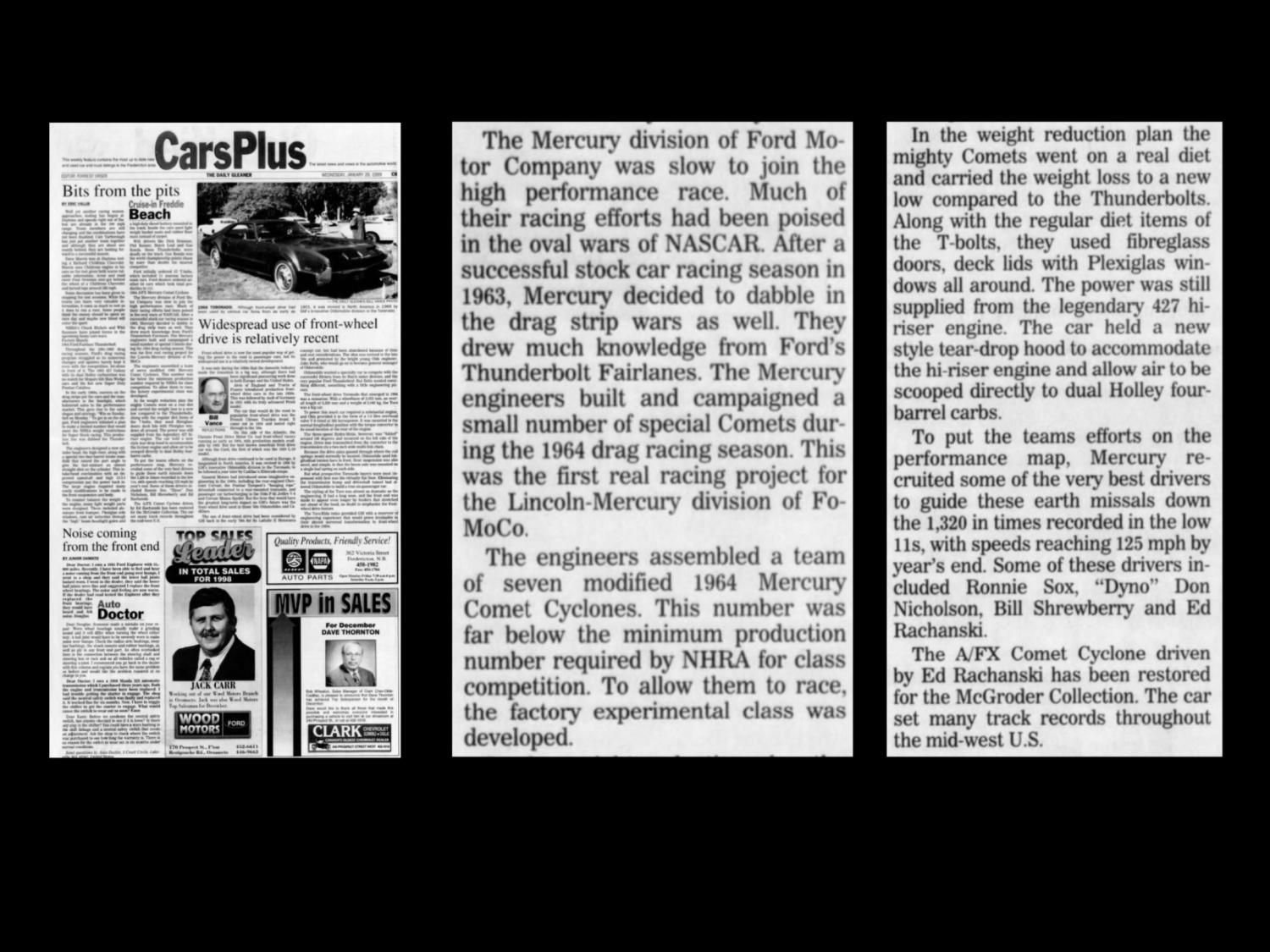 Yes, the Hamb link synopsis of the car is very informative, clipped/included below. Love to hear more of what’s up and/or your connection to the car, PM if best. ![]() ~ Pete . …..No Sale @ Auction: $74.1k # Bids: 36 Auction Date: 30 Apr 2003 Auction: ebay Engine: V8 Trans: manual Interior: red VIN: 4H23-541505 Seller Rating: (89) Book Value: none Bidder Rating: (49) # Produced: 7 Lot #: 2412552972 CONDITION: 1- 3YR UPSIDE: fair - Owner Phoenix, Arizona, U.S.A. Not For Sale - Not a Classified Ad - Owner's Comments / Article Text: CHRIS'S COMMENTS $74.1k is a lot of money for a fairly ordinary-looking muscle Ford, but it's a tough car to value with so few in existence. Cars like this trade on historical importance and personal nostalgia, rather than intrinsic value. Depending on the seller's objective, $74k is pretty good, but he might just re-run it on eBay a few times to see if there are any more rabid takers. ~~~ It ain't pretty, but it's very rare, it's very clean and it's very fast. (Chris Lydiksen) OWNER'S COMMENTS 1964 Mercury Comet "Cyclone" - Factory Lightweight AF/X Race Car. One of Seven originally built by Mercury. Extremely rare and in Concourse Condition. Out of the Pat McGroder Collection (owned by McGroder for eighteen years). These cars were built to complement the Ford Thunderbolts which had a production of 110 cars. Fiberglass Front End, Bumpers, Doors, Trunk Lid with Plexiglass Windows. Raced by Ed Rachanski and still titled in his name. Restored and Documented by Renowned Restoration Expert - Donald Allen from Clarksville, Georgia. This car is phenominal!!!!! 427 Cubic Inch "High Riser" and a Four Speed with Factory Nine Inch Rear Differential. The motor has just been freshened and runs like a "Monster". This is one of the rarest Factory Race Cars in existance. Call John at 602-840-0122 or 602-692-5766 with any questions. Buyer pays actual shipping from Phoenix, Arizona. Money Wire Transfer only. Payment to be completed within three business days from completion of auction. In brand new concourse condition. This car shows near perfect. Paint, Interior, Trunk, Undercarriage and Engine Compartment are gorgeous. "Cyclone" has original J.C. Penney's Slicks on rear.….. . ———————————————————