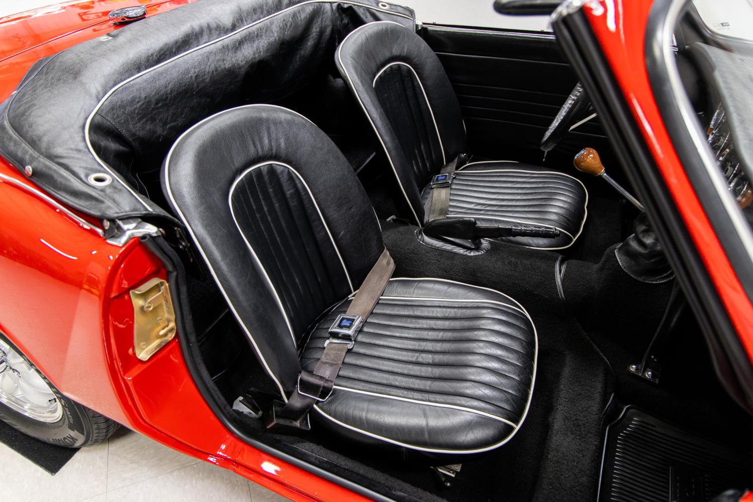 The interior of this car is also in beautiful overall condition throughout. The handsome walnut veneer dash bezel and the hand tooled deep cushioned bucket seats are elegant. The black leather seating surfaces and convertible top cover are decorated with white piping. The banjo style steering wheel fronts Jaeger instrumentation including a 110-mph speedometer, a tachometer, fuel gauge and coolant gauge. The deep dished steering wheel is mounted to a telescopic steering column that is designed to collapse upon impact. Everything in the interior cabin has been restored or replaced new such as the sun visors, rear view mirror, dash pad, dash fascia, door panels, door hardware, wood shift knob, leather shifter boot, seat belts, carpeting and rubber floor mats. It's equipped with a modern Retro Sound stereo. Everything in the interior is in working order including the heating system. The trunk compartment was also stripped to bare metal and repainted in Signal Red. Its home to the trunk mat, spare tire and jack tools.