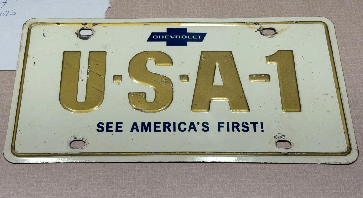 ‘67-‘68 USA-1 “See America’s First” Chevrolet license plate. Good straight heavy steel plate. Great colors. Has some wear and some scuffs but overall good shape. $250 shipped.