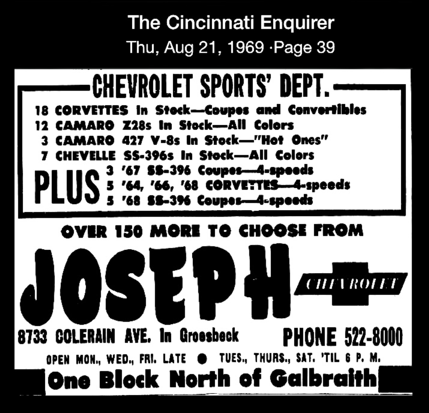 Cool car, I like the period wheel flares too! Others please speak up w/ better info, but Joseph is known to have sold at least five each Yenko Camaros/Chevelles. I have some old Joseph Newspaper Ads saved on my other computer I’ll dig up and post later, but think one Ad notes 20x 427 Camaros in stock? Here’s one 06/69 Ad below w/ what looks like Yenko Camaros/Chevelles/Novas also 427 Camaros/Chevelles in the same Ad. Are any Joseph sold Non-Yenko Copo cars known, or any Yenko Novas? ![]() Welcome aboard! ![]() ~ Pete .