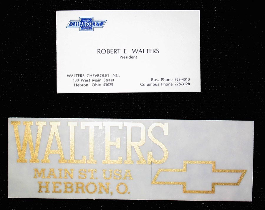 I received in the mail today three perfect NOS Walters Chevrolet stickers, a roll of posters that Mr. Walters had done up for the dealership's 50th anniversary in his family in 1976, a copy of his old business card and a really nice note.