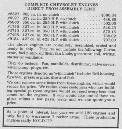 Here's a small excerpt from a 1967 Nickey parts ad. It was in the January 1967 Popular Hot Rodding. Read it and weep. Oh, and I'll take ten 427/425's please.