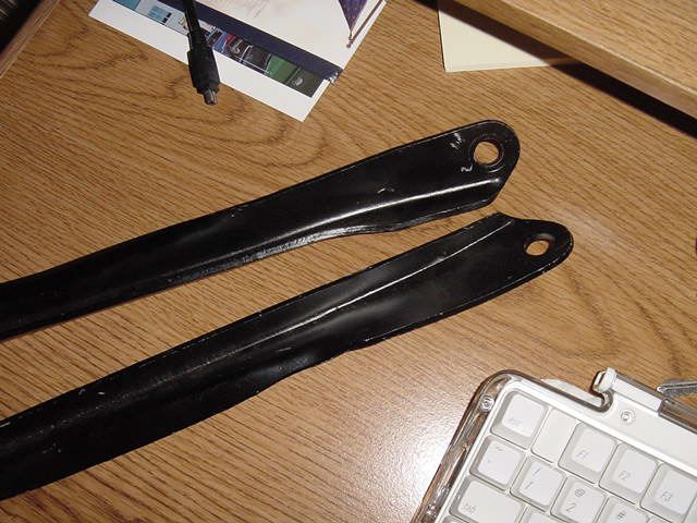 Those are the F41 Rear support frame brackets.They bolt to the same support as the Boxed lower control arm,then trail up to the top of the mid Rear frame rail,over the pumpkin.They should be around 18 inches long.They prevent twisting of the frame,and cloners almost ALWAYS forget to include these.It's one of the first things I look for on a questionable car.