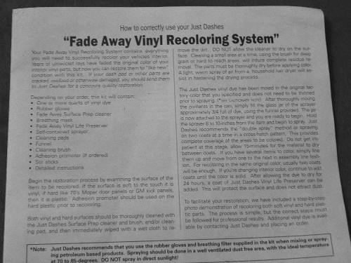 Darren, I used the Fade Away Vinyl Recoloring System from Just Dashes. I have some blue left over from doing my interior pieces for my 69 Chevelle. If you send them an original piece with the correct color, they will match it. It is a little expensive for all you need though, I think a 1 quart kit cost me $115 back then but I did all my vinyl and plastic pieces for my Chevelle. My interior was dark blue, if you have any questions call me at 717-734-3010.