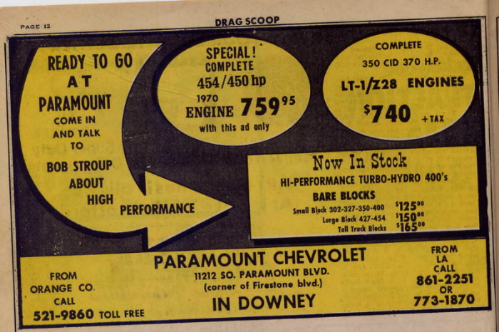 Here is an ad from a dealer within a few miles of Dana Chevrolet. 1970 LS6 454 crate for $750 and an LT1 350 for a hair less. I would buy 3 of each now at that price now. this ad was from August 1972.