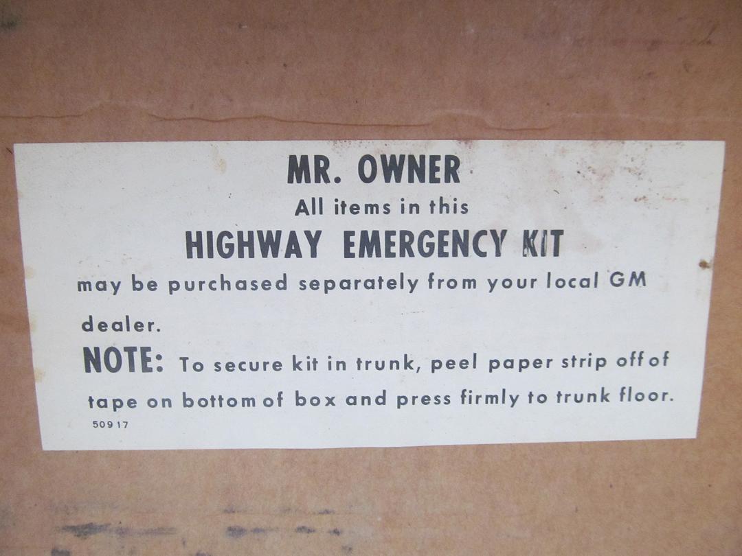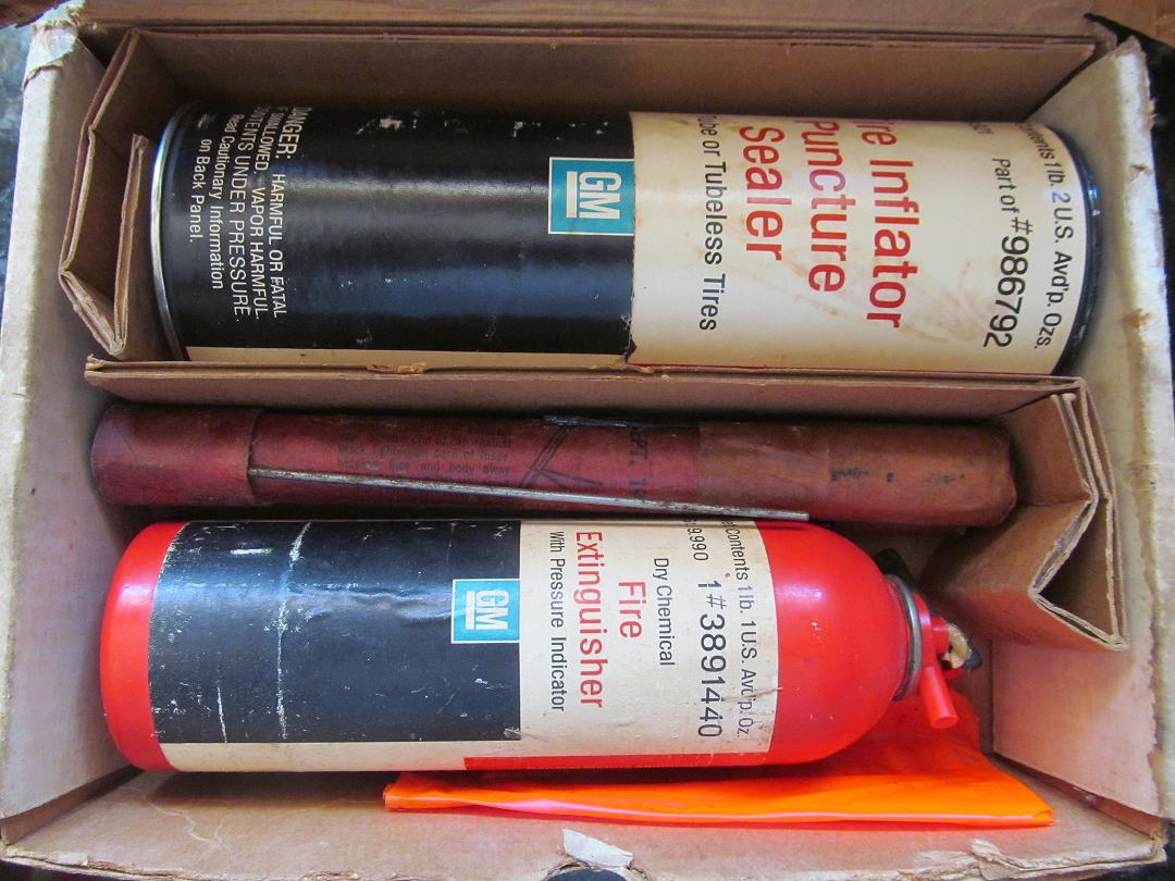 an nos gm highway kit as shown. 2 flares,flag,tire inflator and fire extinguisher. box shows some wear i can provide more pics if needed. Complete and hard to find unused and without missing items . 399.00