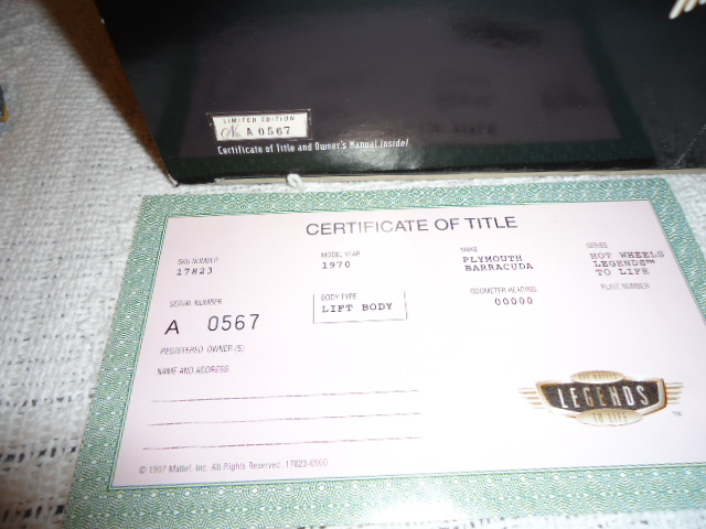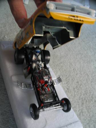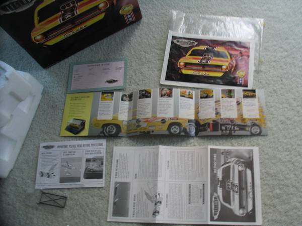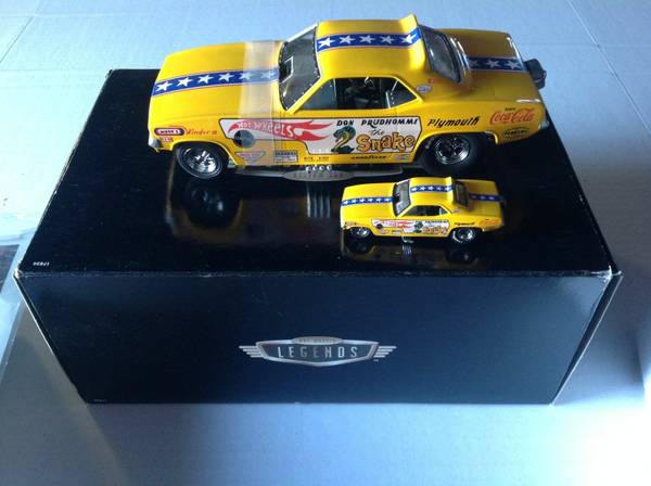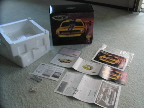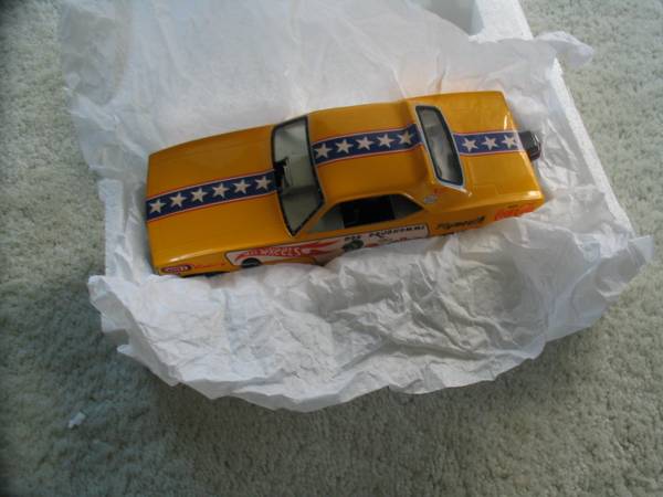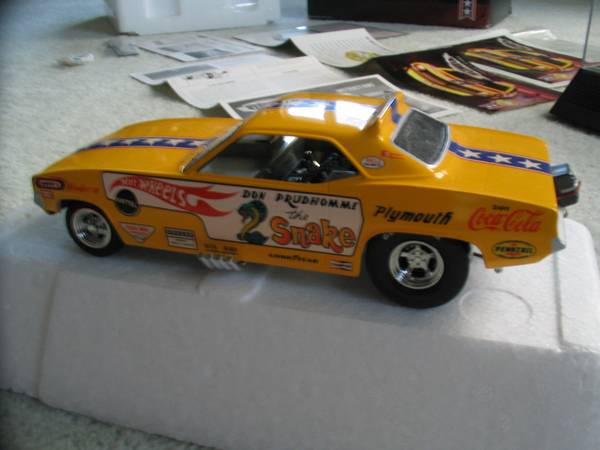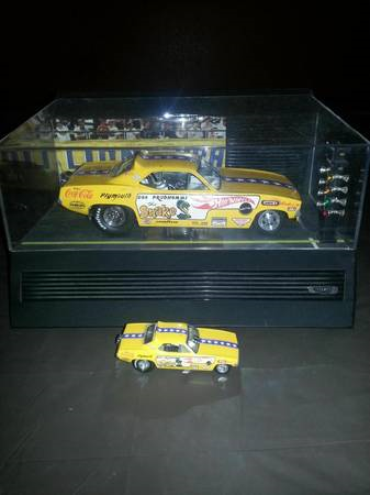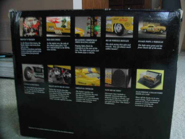 It's a 1/24 scale Plymouth Barracuda working Funny Car.No imperfections at all in mint condition. I've only taken it it out the box once since buying it brand new 20 years ago.I put batteries in it and tested it a few times and it performed perfectly.Funny Car,base & display case are in excellent to mint condition.No chips,no faded paint or scuffs.As you play the cassette tape,the body comes upwards,the blower belt turns the headers light up the body shakes,the rear wheels spin,the tree lights count down,and the late Steve Evans announces as it all as it puts a great big smile on your face. Here's a couple of youtube vids showing one work.. https://www.youtube.com/watch?v=FQAg3bIHFcQ https://www.youtube.com/watch?v=CQLmChL29sk Everything functions as they should in auto & manual mode. Side A of the cassette plays the drag race sequence,side B plays interviews by Steve Evans and tons of burnouts. Includes original box,ORIGINAL RARELY SEEN OUTSIDE SHIPPING CARTON,Funny car,display case,body hold open rod for display, and all original paperwork and cassette tape etc.Serial #'s match too. As an added bonus,I'm including the the smaller scale 1/64 version Snake funny car that opens up too with same details.This little car was only included with the larger static version of this car,but when I bought this new from the factory,I asked them to include & charge me for one,along with the larger display car. I'm the original owner,when I bought it from Mattel in the mid 1990's and so far it's spent 99.5% of its life in the box. Uses 4 D cell batteries not included. Asking $500 oBo with money back guarantee if not as stated. Rick REDL78@ATT.NET |